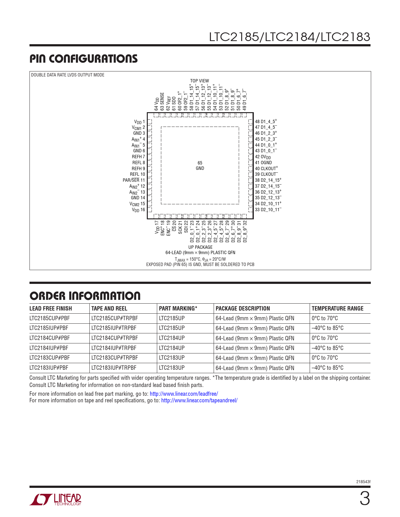 DOUBLE DATA RATE LVDS OUTPUT MODE TOP VIEW + – + – + – + – + – + – DD REF 64 V 63 SENSE 62 V 61 SDO 60 OF2_1 59 OF2_1 58 D1_14_15 57 D1_14_15 56 D1_12_13 55 D1_12_13 54 D1_10_11 53 D1_10_11 52 D1_8_9 51 D1_8_9 50 D1_6_7 49 D1_6_7 VDD 1 48 D1_4_5+ VCM1 2 47 D1_4_5– GND 3 46 D1_2_3+ A + IN1 4 45 D1_2_3– A – IN1 5 44 D1_0_1+ GND 6 43 D1_0_1– REFH 7 42 OVDD REFL 8 65 41 OGND REFH 9 GND 40 CLKOUT+ REFL 10 39 CLKOUT– PAR/SER 11 38 D2_14_15+ A + IN2 12 37 D2_14_15– A – IN2 13 36 D2_12_13+ GND 14 35 D2_12_13– VCM2 15 34 D2_10_11+ VDD 16 33 D2_10_11– 17 18 20 + – 19 – 23 + 24 – 25 + 26 – 27 + 28 – 29 + 30 – 31 + 32 V DD CS ENC ENC SCK 21 SDI 22 D2_0_1 D2_0_1 D2_2_3 D2_2_3 D2_4_5 D2_4_5 D2_6_7 D2_6_7 D2_8_9 D2_8_9 UP PACKAGE 64-LEAD (9mm × 9mm) PLASTIC QFN TJMAX = 150°C, θJA = 20°C/W EXPOSED PAD (PIN 65) IS GND, MUST BE SOLDERED TO PCB