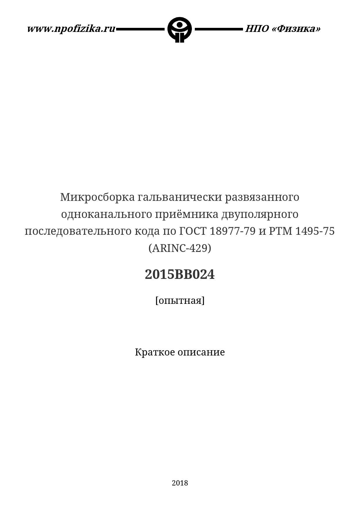 ОписаниеМикросборка гальванически развязанногоодноканального приёмника двуполярногопоследовательного кода по ГОСТ 18977-79и РТМ 1495-75(ARINC-429)2015ВВ024 [опытная] Краткое описание