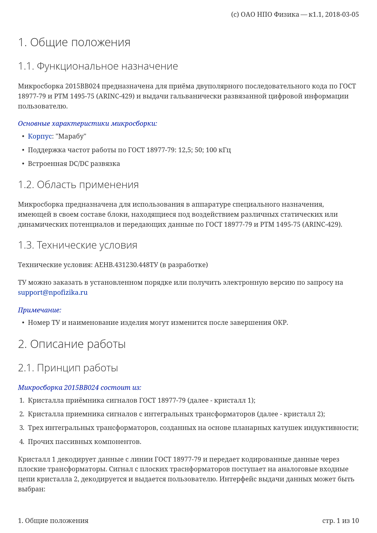 link to page 7 (c) ОАО НПО Физика — к1.1, 2018-03-05 1 Общие положения 1.1 Функциональное назначение Микросборка 2015ВВ024 предназначена