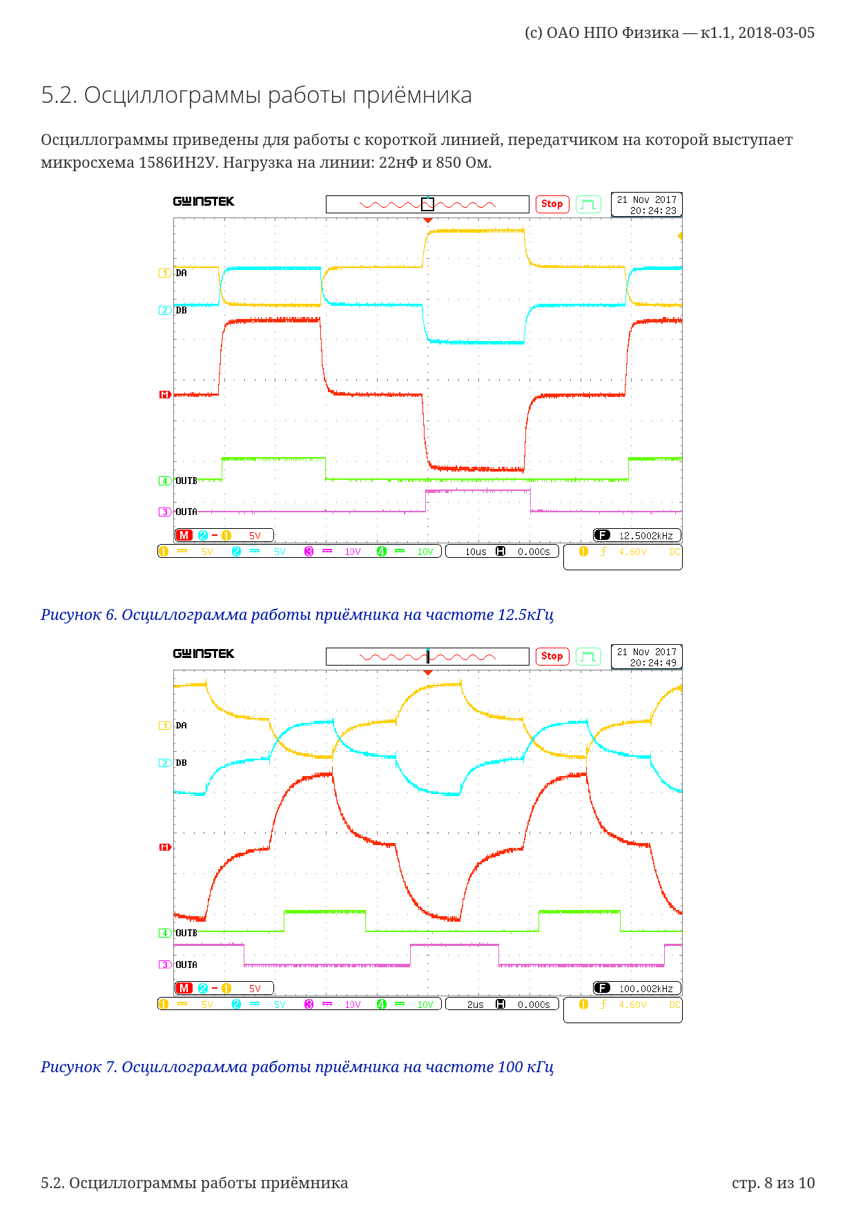 (c). ОАО. НПО. Физика — к1.1,. 2018-03-05. 5.2. Осциллограммы. работы. приёмника. Осциллограммы. приведены. для. работы. с. короткой. линией,