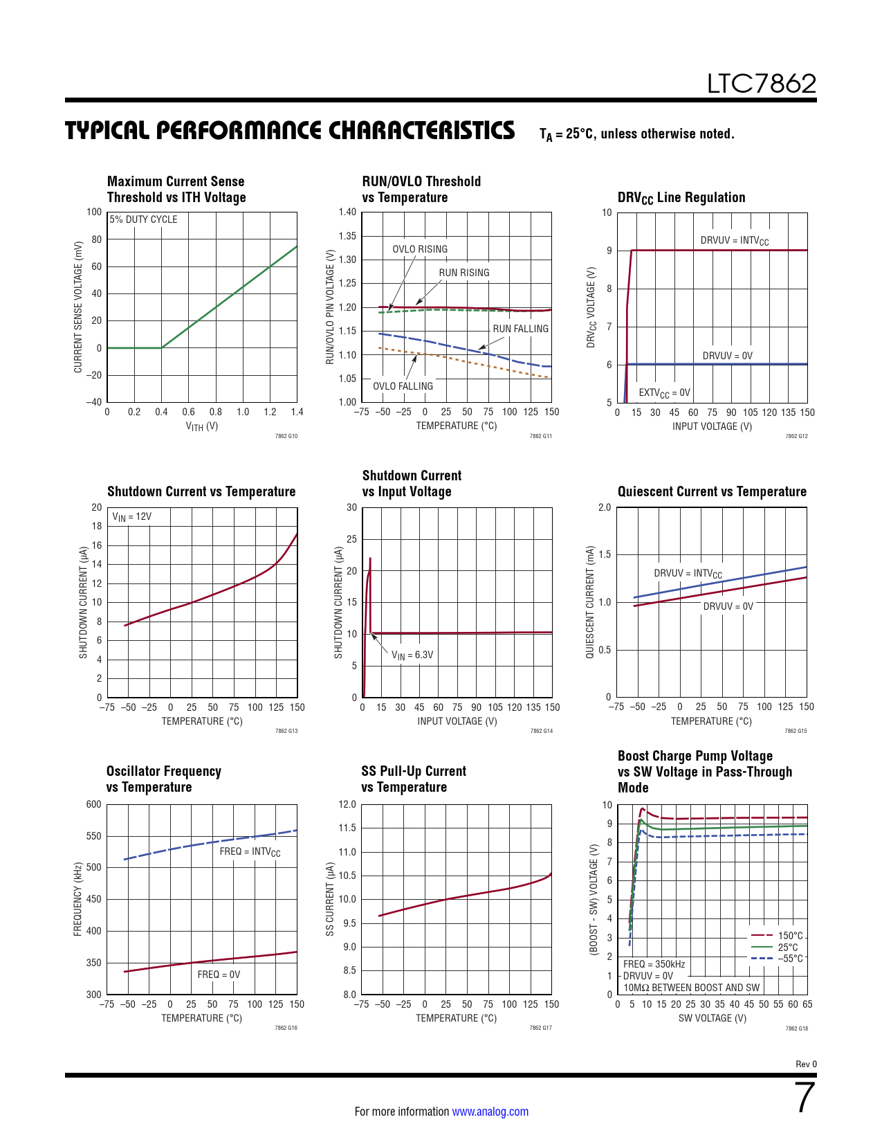 100 1.40 10 5% DUTY CYCLE 1.35 80 DRVUV = INTV OVLO RISING CC 9 1.30 60 RUN RISING TAGE (mV) TAGE (V) 1.25 40 8 TAGE (V) 1.20 20 VOL 1.15 RUN FALLING CC 7 0 DRV 1.10 RUN/OVLO PIN VOL DRVUV = 0V CURRENT SENSE VOL 6 –20 1.05 OVLO FALLING EXTVCC = 0V –40 1.00 5 0 0.2 0.4 0.6 0.8 1.0 1.2 1.4 –75 –50 –25 0 25 50 75 100 125 150 0 15 30 45 60 75 90 105 120 135 150 VITH (V) TEMPERATURE (°C) INPUT VOLTAGE (V) 7862 G10 7862 G11 7862 G12