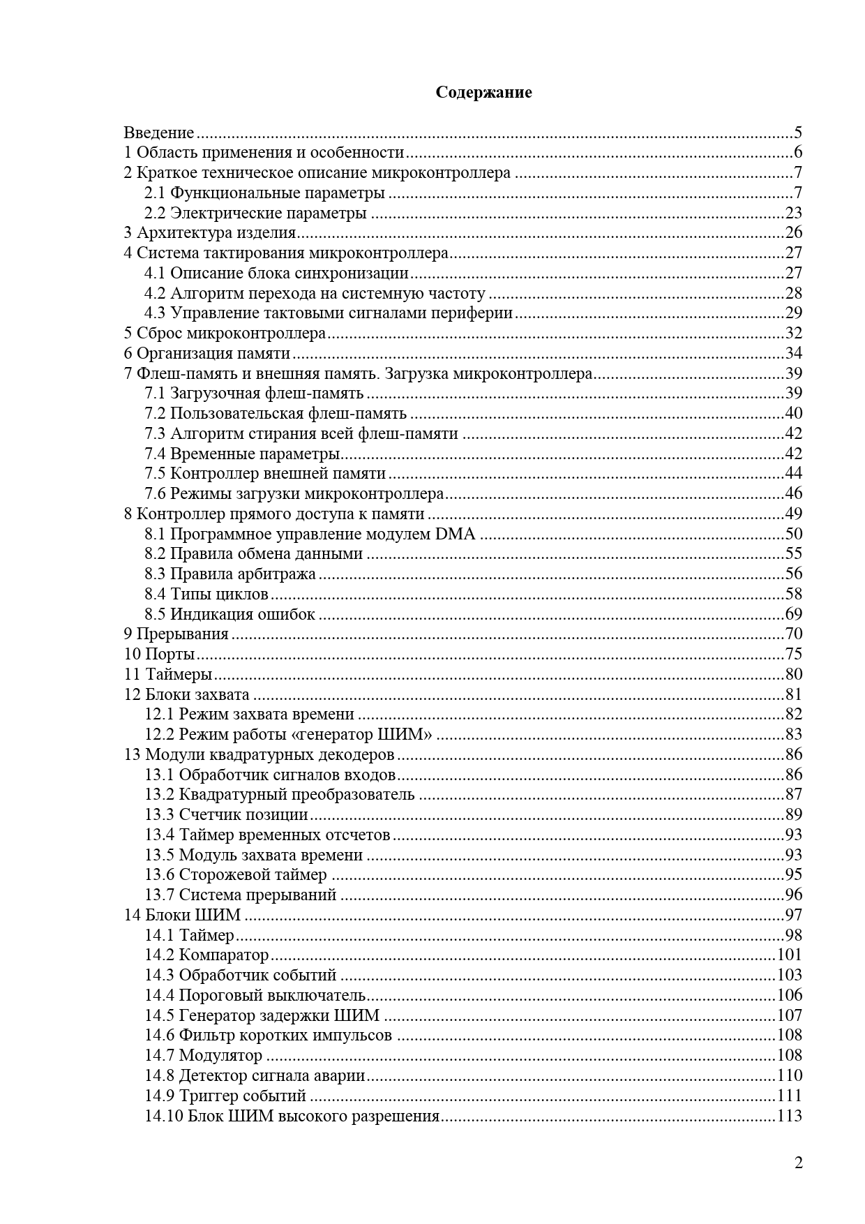 link to page 5 link to page 6 link to page 7 link to page 7 link to page 23 link to page 26 link to page 27 link to page 27 link to page 28 link to page 29 link to page 32 link to page 34 link to page 39 link to page 39 link to page 40 link to page 42 link to page 42 link to page 44 link to page 46 link to page 49 link to page 50 link to page 55 link to page 56 link to page 58 link to page 69 link to page 70 link to page 75 link to page 80 link to page 81 link to page 82 link to page 83 link to page 86 link to page 86 link to page 87 link to page 89 link to page 93 link to page 93 link to page 95 link to page 96 link to page 97 link to page 98 link to page 101 link to page 103 link to page 106 link to page 107 link to page 108 link to page 108 link to page 110 link to page 111 link to page 113 КФДЛ.431295.057ТО Содержание Введение ... 5 1 Область применения и особенности ... 6 2 Краткое техническое описание микроконтроллера .. 7 2.1 Функциональные параметры ... 7 2.2 Электрические параметры ... 23 3 Архитектура изделия .. 26 4 Система тактирования микроконтроллера ... 27 4.1 Описание блока синхронизации .. 27 4.2 Алгоритм перехода на системную частоту .. 28 4.3 Управление тактовыми сигналами периферии .. 29 5 Сброс микроконтроллера ... 32 6 Организация памяти ... 34 7 Флеш-память и внешняя память. Загрузка микроконтроллера.. 39 7.1 Загрузочная флеш-память .. 39 7.2 Пользовательская флеш-память .. 40 7.3 Алгоритм стирания всей флеш-памяти .. 42 7.4 Временные параметры.. 42 7.5 Контроллер внешней памяти ... 44 7.6 Режимы загрузки микроконтроллера .. 46 8 Контроллер прямого доступа к памяти .. 49 8.1 Программное управление модулем DMA .. 50 8.2 Правила обмена данными .. 55 8.3 Правила арбитража ... 56 8.4 Типы циклов .. 58 8.5 Индикация ошибок ... 69 9 Прерывания ... 70 10 Порты ... 75 а 11 Таймеры ... 80 12 Блоки захвата .. 81 . и дат 12.1 Режим захвата времени .. 82 дп 12.2 Режим работы «генератор ШИМ» .. 83 По 13 Модули квадратурных декодеров ... 86 . 13.1 Обработчик сигналов входов ... 86 бл 13.2 Квадратурный преобразователь .. 87 ду 13.3 Счетчик позиции ... 89 № 13.4 Таймер временных отсчетов .. 93 в. 13.5 Модуль захвата времени .. 93 Ин 13.6 Сторожевой таймер .. 95 № 13.7 Система прерываний .. 96 14 Блоки ШИМ .. 97 . инв. 14.1 Таймер м .. 98 за 14.2 Компаратор .. 101 В 14.3 Обработчик событий .. 103 а 14.4 Пороговый выключатель .. 106 14.5 Генератор задержки ШИМ .. 107 . и дат 14.6 Фильтр коротких импульсов ... 108 дп 14.7 Модулятор ... 108 По 14.8 Детектор сигнала аварии .. 110 . 14.9 Триггер событий ... 111 подл 14.10 Блок ШИМ высокого разрешения ... 113 № в. Ин 2