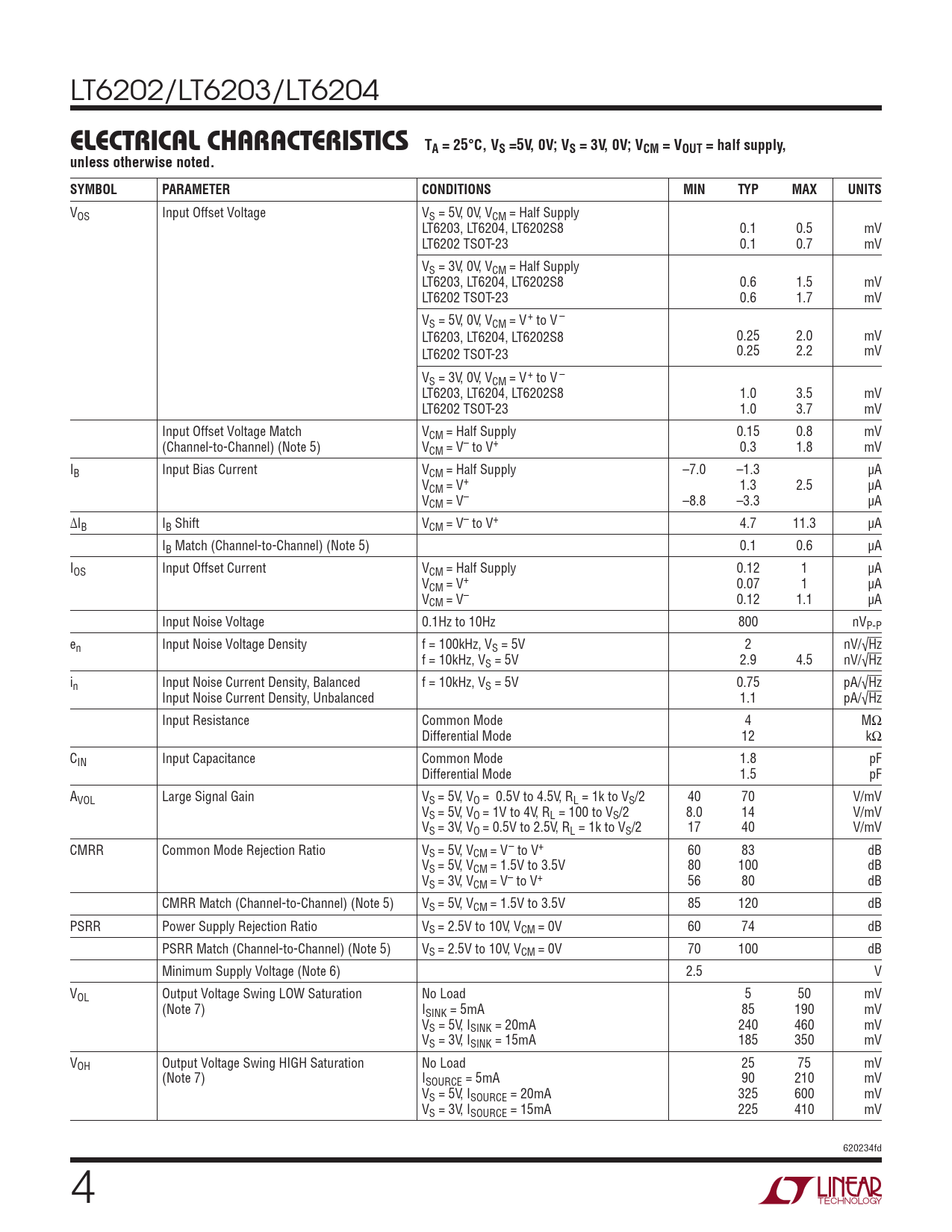 VOS Input Offset Voltage VS = 5V, 0V, VCM = Half Supply LT6203, LT6204, LT6202S8 0.1 0.5 mV LT6202 TSOT-23 0.1 0.7 mV VS = 3V, 0V, VCM = Half Supply LT6203, LT6204, LT6202S8 0.6 1.5 mV LT6202 TSOT-23 0.6 1.7 mV VS = 5V, 0V, VCM = V+ to V – LT6203, LT6204, LT6202S8 0.25 2.0 mV LT6202 TSOT-23 0.25 2.2 mV VS = 3V, 0V, VCM = V+ to V – LT6203, LT6204, LT6202S8 1.0 3.5 mV LT6202 TSOT-23 1.0 3.7 mV Input Offset Voltage Match VCM = Half Supply 0.15 0.8 mV (Channel-to-Channel) (Note 5) VCM = V– to V+ 0.3 1.8 mV IB Input Bias Current VCM = Half Supply –7.0 –1.3 µA VCM = V+ 1.3 2.5 µA VCM = V– –8.8 –3.3 µA ∆IB IB Shift VCM = V– to V+ 4.7 11.3 µA IB Match (Channel-to-Channel) (Note 5) 0.1 0.6 µA IOS Input Offset Current VCM = Half Supply 0.12 1 µA VCM = V+ 0.07 1 µA VCM = V– 0.12 1.1 µA Input Noise Voltage 0.1Hz to 10Hz 800 nVP-P en Input Noise Voltage Density f = 100kHz, VS = 5V 2 nV/√Hz f = 10kHz, VS = 5V 2.9 4.5 nV/√Hz in Input Noise Current Density, Balanced f = 10kHz, VS = 5V 0.75 pA/√Hz Input Noise Current Density, Unbalanced 1.1 pA/√Hz Input Resistance Common Mode 4 MΩ Differential Mode 12 kΩ CIN Input Capacitance Common Mode 1.8 pF Differential Mode 1.5 pF AVOL Large Signal Gain VS = 5V, VO = 0.5V to 4.5V, RL = 1k to VS/2 40 70 V/mV VS = 5V, VO = 1V to 4V, RL = 100 to VS/2 8.0 14 V/mV VS = 3V, VO = 0.5V to 2.5V, RL = 1k to VS/2 17 40 V/mV CMRR Common Mode Rejection Ratio VS = 5V, VCM = V– to V+ 60 83 dB VS = 5V, VCM = 1.5V to 3.5V 80 100 dB VS = 3V, VCM = V– to V+ 56 80 dB CMRR Match (Channel-to-Channel) (Note 5) VS = 5V, VCM = 1.5V to 3.5V 85 120 dB PSRR Power Supply Rejection Ratio VS = 2.5V to 10V, VCM = 0V 60 74 dB PSRR Match (Channel-to-Channel) (Note 5) VS = 2.5V to 10V, VCM = 0V 70 100 dB Minimum Supply Voltage (Note 6) 2.5 V VOL Output Voltage Swing LOW Saturation No Load 5 50 mV (Note 7) ISINK = 5mA 85 190 mV VS = 5V, ISINK = 20mA 240 460 mV VS = 3V, ISINK = 15mA 185 350 mV VOH Output Voltage Swing HIGH Saturation No Load 25 75 mV (Note 7) ISOURCE = 5mA 90 210 mV VS = 5V, ISOURCE = 20mA 325 600 mV VS = 3V, ISOURCE = 15mA 225 410 mV 620234fd 4 Document Outline Features Applications Description Typical Application Absolute Maximum Ratings Pin Configuration Order Information Electrical Characteristics Typical Performance Characteristics Applications Information Typical Applications Package Description Revision History Typical Application Related Parts