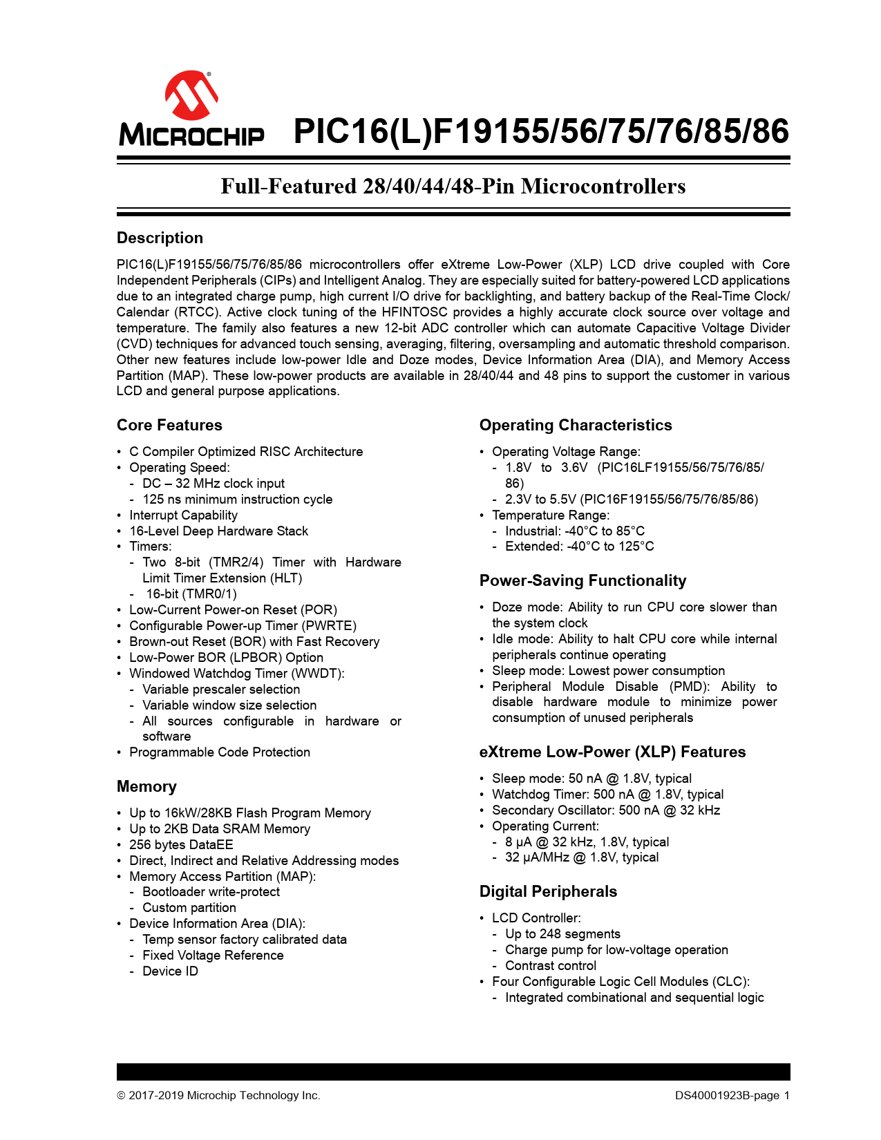 PIC16(L)F19155/56/75/76/85/86. Full-Featured 28/40/44/48-Pin Microcontrollers. Description. Core Features