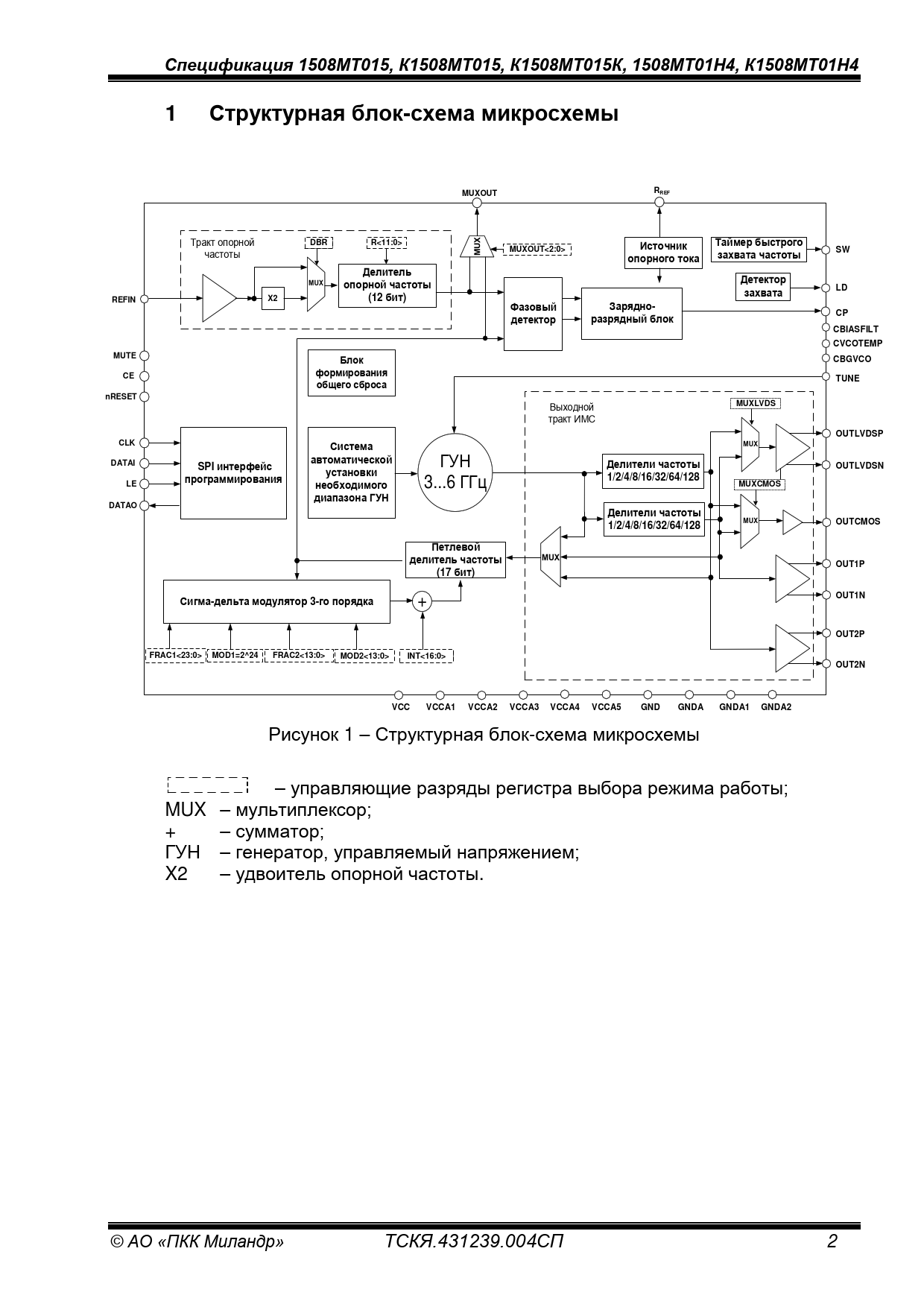 Спецификация 1508МТ015, К1508МТ015, К1508МТ015К, 1508МТ01Н4, К1508МТ01Н4. Структурная блок-схема микросхемы. MUXOUT. RREF