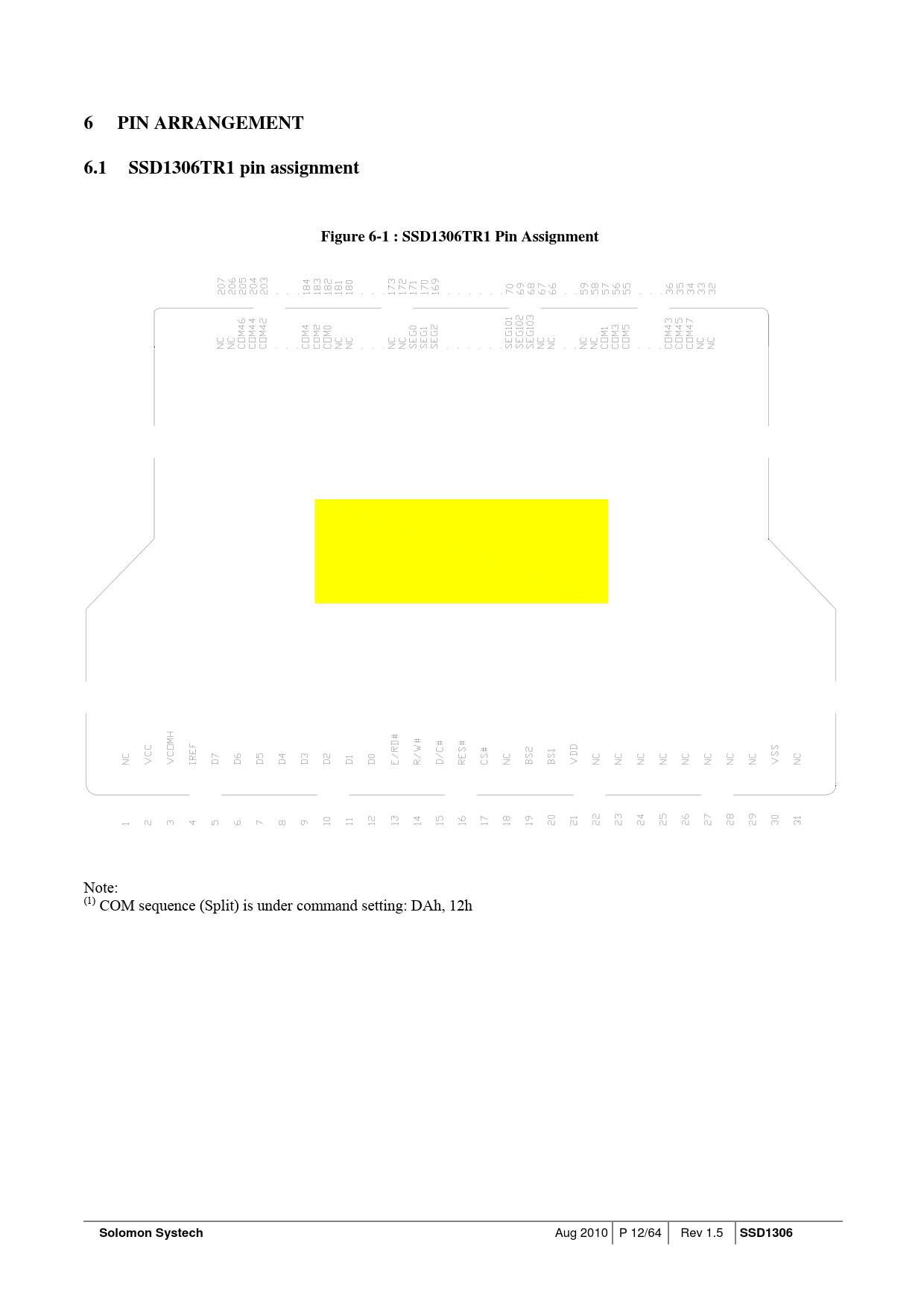 6PIN ARRANGEMENT6.1 SSD1306TR1 pin assignmentFigure 6-1 : SSD1306TR1 Pin Assignment Note: (1) COM sequence (Split) is under command setting: DAh, 12h Solomon Systech Aug 2010 P 12/64 Rev 1.5 SSD1306 Document Outline 1 GENERAL DESCRIPTION 2 FEATURES 3 ORDERING INFORMATION 4 BLOCK DIAGRAM 5 DIE PAD FLOOR PLAN 6 PIN ARRANGEMENT 6.1 SSD1306TR1 pin assignment 7 PIN DESCRIPTION 8 FUNCTIONAL BLOCK DESCRIPTIONS 8.1 MCU Interface selection 8.1.1 MCU Parallel 6800-series Interface 8.1.2 MCU Parallel 8080-series Interface 8.1.3 MCU Serial Interface (4-wire SPI) 8.1.4 MCU Serial Interface (3-wire SPI) 8.1.5 MCU I2C Interface 8.1.5.1 I2C-bus Write data 8.1.5.2 Write mode for I2C 8.2 Command Decoder 8.3 Oscillator Circuit and Display Time Generator 8.4 FR synchronization 8.5 Reset Circuit 8.6 Segment Drivers / Common Drivers 8.7 Graphic Display Data RAM (GDDRAM) 8.8 SEG/COM Driving block 8.9 Power ON and OFF sequence 8.9.1 Power ON and OFF sequence with External VCC 8.9.2 Power ON and OFF sequence with Charge Pump Application 8.10 Charge Pump Regulator 9 COMMAND TABLE 9.1 Data Read / Write 10 COMMAND DESCRIPTIONS 10.1 Fundamental Command 10.1.1 Set Lower Column Start Address for Page Addressing Mode (00h~0Fh) 10.1.2 Set Higher Column Start Address for Page Addressing Mode (10h~1Fh) 10.1.3 Set Memory Addressing Mode (20h) 10.1.4 Set Column Address (21h) 10.1.5 Set Page Address (22h) 10.1.6 Set Display Start Line (40h~7Fh) 10.1.7 Set Contrast Control for BANK0 (81h) 10.1.8 Set Segment Re-map (A0h/A1h) 10.1.9 Entire Display ON (A4h/A5h) 10.1.10 Set Normal/Inverse Display (A6h/A7h) 10.1.11 Set Multiplex Ratio (A8h) 10.1.12 Set Display ON/OFF (AEh/AFh) 10.1.13 Set Page Start Address for Page Addressing Mode (B0h~B7h) 10.1.14 Set COM Output Scan Direction (C0h/C8h) 10.1.15 Set Display Offset (D3h) 10.1.16 Set Display Clock Divide Ratio/ Oscillator Frequency (D5h) 10.1.17 Set Pre-charge Period (D9h) 10.1.18 Set COM Pins Hardware Configuration (DAh) 10.1.19 Set VCOMH Deselect Level (DBh) 10.1.20 NOP (E3h) 10.1.21 Status register Read 10.1.22 Charge Pump Setting (8Dh) 10.2 Graphic Acceleration Command 10.2.1 Horizontal Scroll Setup (26h/27h) 10.2.2 Continuous Vertical and Horizontal Scroll Setup (29h/2Ah) 10.2.3 Deactivate Scroll (2Eh) 10.2.4 Activate Scroll (2Fh) 10.2.5 Set Vertical Scroll Area(A3h) 10.3 Advance Graphic Command 10.3.1 Set Fade Out and Blinking (23h) 10.3.2 Set Zoom In (D6h) 11 MAXIMUM RATINGS 12 DC CHARACTERISTICS 13 AC CHARACTERISTICS 14 Application Example 15 PACKAGE INFORMATION 15.1 SSD1306TR1 Detail Dimension 15.2 SSD1306Z2 Die Tray Information