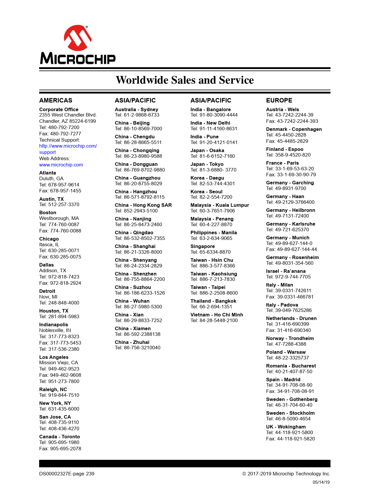 Fax: 44-118-921-5820 Tel: 905-695-1980 Fax: 905-695-2078 DS00002327E-page 239  2017-2019 Microchip Technology Inc. 05/14/19 Document Outline 1.0 Preface 1.1 Glossary of Terms TABLE 1-1: General Terms 1.2 Buffer Types TABLE 1-2: Buffer Types 1.3 Register Nomenclature TABLE 1-3: Register Nomenclature 1.4 References 2.0 Introduction 2.1 General Description FIGURE 2-1: Internal Block Diagram 3.0 Pin Descriptions and Configuration 3.1 Pin Assignments FIGURE 3-1: Pin Assignments (Top View) TABLE 3-1: Pin Assignments 3.2 Pin Descriptions TABLE 3-2: Pin Descriptions 3.2.1 Configuration Straps TABLE 3-3: Configuration Strap Descriptions 4.0 Functional Description 4.1 Physical Layer Transceiver (PHY) 4.1.1 100BASE-TX Transceiver 4.1.2 10BASE-T/Te Transceiver 4.1.3 Auto MDI/MDI-X TABLE 4-1: MDI/MDI-X Pin Definitions 4.1.4 Wave Shaping, Slew-Rate Control, and Partial Response 4.1.5 Auto-Negotiation FIGURE 4-1: Auto-Negotiation and Parallel Operation 4.1.6 Quiet-WIRE Filtering TABLE 4-2: Enabling and Disabling Quiet-WIRE 4.1.7 Fast Link-Up 4.1.8 LinkMD®+ Enhanced Diagnostics: Receive Signal Quality Indicator 4.1.9 Remote PHY Loopback FIGURE 4-2: Remote PHY Loopback 4.2 LEDs 4.2.1 Single-LED Mode TABLE 4-3: Single-LED Mode Pin Definition 4.2.2 Tri-Color Dual-LED Mode TABLE 4-4: Tri-Color Dual-LED Mode Pin Definition 4.3 Media Access Controller (MAC) 4.3.1 MAC Operation 4.3.2 Inter-Packet Gap (IPG) 4.3.3 Back-Off Algorithm 4.3.4 Late Collision 4.3.5 Legal Packet Size 4.3.6 Flow Control 4.3.7 Half-Duplex Back Pressure 4.3.8 Flow Control and Back Pressure Registers TABLE 4-5: Flow Control and back Pressure Registers 4.3.9 Broadcast Storm Protection 4.3.10 Self-Address Filtering 4.4 Switch 4.4.1 Switching Engine 4.4.2 Address Lookup TABLE 4-6: Address Lookup Table Hashing Options TABLE 4-7: Reserved Multicast Address Table FIGURE 4-3: Packet Forwarding Process Flowchart TABLE 4-8: Lookup Engine Registers 4.4.3 IEEE 802.1Q VLAN TABLE 4-9: VLAN Forwarding TABLE 4-10: Hashed(DA) + FID Lookup in VLAN Mode TABLE 4-11: Hashed(SA) + FID Lookup in VLAN Mode TABLE 4-12: VLAN Registers 4.4.4 Quality-of-Service (QoS) Priority Support FIGURE 4-4: 802.p Priority Field Format 4.4.5 Traffic Conditioning & Policing 4.4.6 Spanning Tree Support TABLE 4-13: Spanning Tree States 4.4.7 Rapid Spanning Tree Support 4.4.8 Multiple Spanning Tree Support 4.4.9 Tail Tagging Mode FIGURE 4-5: Tail Tag Frame Format TABLE 4-14: Receive Tail Tag Format (from Switch to Host) TABLE 4-15: Transmit Tail Tag Format (from Host to Switch) FIGURE 4-6: PTP Mode Tail Tag Frame Format 4.4.10 IGMP Support 4.4.11 IPv6 MLD Snooping 4.4.12 Port Mirroring 4.4.13 Scheduling and Rate Limiting 4.4.14 Egress Traffic Shaping 4.4.15 Low Latency Cut-Through Mode 4.4.16 Ingress MAC Address Filtering Function 4.4.17 802.1X Access Control 4.4.18 Access Control List (ACL) Filtering TABLE 4-16: ACL Processing Entry Parameters FIGURE 4-7: ACL Structure and Example Rule Values TABLE 4-17: Matching Rule Options TABLE 4-18: ACL Matching Rule Parameters for MD = 01 TABLE 4-19: ACL Matching Rule Parameters for MD = 10 TABLE 4-20: ACL Matching Rule Parameters for MD = 11 TABLE 4-21: ACL Action Rule Parameters for Non-count Modes (MD ≠ 01 or ENB ≠ 00) TABLE 4-22: ACL Action Rule Parameters for count Mode (MD = 01 or ENB = 00) FIGURE 4-8: ACL Table Format TABLE 4-23: ACL Registers 4.5 IEEE 1588 Precision Time Protocol 4.5.1 IEEE 1588 PTP System Time Clock FIGURE 4-9: PTP System Clock Overview 4.5.2 IEEE 1588 PTP Messaging Processing 4.5.3 IEEE 1588 PTP Event Triggering and Timestamping 4.6 Audio Video Bridging and Time Sensitive Networks 4.7 NAND Tree Support TABLE 4-24: NAND Tree Test Pin Order 4.8 Clocking 4.8.1 Primary Clock 4.8.2 MAC Interface Clocks 4.8.3 Serial Management Interface Clock 4.8.4 Synchronous Ethernet and SYNCLKO 4.9 Power FIGURE 4-10: Power Connection Diagram 4.10 Power Management TABLE 4-25: MDI/MDI-X Pin Definitions 4.10.1 Normal Operation Mode 4.10.2 Energy-Detect Mode 4.10.3 Global Soft Power-Down Mode 4.10.4 Port-Based Power Down 4.10.5 Energy Efficient Ethernet (EEE) FIGURE 4-11: Traffic Activity and EEE 4.10.6 Wake on LAN (WoL) 4.11 Management Interface 4.11.1 SPI Slave Bus TABLE 4-26: Register Access using the SPI Interface FIGURE 4-12: SPI Register Read Operation FIGURE 4-13: SPI Register Write Operation 4.11.2 I2C Bus FIGURE 4-14: Single Byte Register Write FIGURE 4-15: Single Byte Register Read FIGURE 4-16: Burst Register Write FIGURE 4-17: Burst Register Read 4.11.3 MII Management (MIIM) Interface TABLE 4-27: MII Management Interface Frame Format TABLE 4-28: Standard MIIM Registers 4.12 In-Band Management FIGURE 4-18: In-Band Management Frame Format 4.13 MAC Interface (RGMII/MII/RMII Port 5) 4.13.1 Media Independent Interface (MII) TABLE 4-29: MII (PHY Mode) Connection to External MAC TABLE 4-30: MII (MAC Mode) Connection to External PHY 4.13.2 Reduced Media Independent Interface (RMII) TABLE 4-31: RMII Signal Descriptions TABLE 4-32: RMII Connection to External MAC TABLE 4-33: RMII Connection to External PHY 4.13.3 Reduced Gigabit Media Independent Interface (RGMII) TABLE 4-34: RGMII Signal Descriptions 5.0 Device Registers FIGURE 5-1: Register Address Mapping FIGURE 5-2: Byte Ordering TABLE 5-1: Global Register Address Map TABLE 5-2: Port N (1-7) Register Address Map 5.1 Global Registers 5.1.1 Global Operation Control Registers (0x0000 - 0x00FF) 5.1.2 Global I/O Control Registers (0x0100 - 0x01FF) 5.1.3 Global PHY Control and Status Registers (0x0200 - 0x02FF) 5.1.4 Global Switch Control Registers (0x0300 - 0x03FF) 5.1.5 Global Switch Look Up Engine (LUE) Control Registers (0x0400 - 0x04FF) 5.1.6 Global Switch PTP Control Registers (0x0500 - 0x05FF) 5.2 Port Registers 5.2.1 Port N: Port Operation Control Registers (0xN000 - 0xN0FF) 5.2.2 Port N: Port Ethernet PHY Registers (0xN100 - 0xN1FF) 5.2.3 Port N: Port RGMII/MII/RMII Control Registers (0xN300 - 0xN3FF) 5.2.4 Port N: Port Switch MAC Control Registers (0xN400 - 0xN4FF) TABLE 5-3:
