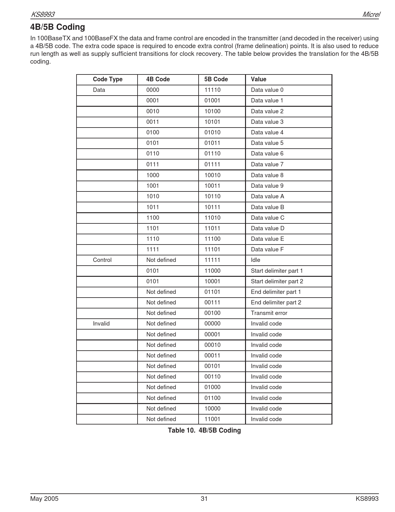 KS8993 Micrel 4B/5B Coding In 100BaseTX and 100BaseFX the data and frame control are encoded in the transmitter (and decoded in the receiver) using a 4B/5B code. The extra code space is required to encode extra control (frame delineation) points. It is also used to reduce run length as well as supply sufficient transitions for clock recovery. The table below provides the translation for the 4B/5B coding. Code Type4B Code5B CodeValue Data 0000 11110 Data value 0 0001 01001 Data value 1 0010 10100 Data value 2 0011 10101 Data value 3 0100 01010 Data value 4 0101 01011 Data value 5 0110 01110 Data value 6 0111 01111 Data value 7 1000 10010 Data value 8 1001 10011 Data value 9 1010 10110 Data value A 1011 10111 Data value B 1100 11010 Data value C 1101 11011 Data value D 1110 11100 Data value E 1111 11101 Data value F Control Not defined 11111 Idle 0101 11000 Start delimiter part 1 0101 10001 Start delimiter part 2 Not defined 01101 End delimiter part 1 Not defined 00111 End delimiter part 2 Not defined 00100 Transmit error Invalid Not defined 00000 Invalid code Not defined 00001 Invalid code Not defined 00010 Invalid code Not defined 00011 Invalid code Not defined 00101 Invalid code Not defined 00110 Invalid code Not defined 01000 Invalid code Not defined 01100 Invalid code Not defined 10000 Invalid code Not defined 11001 Invalid code Table 10. 4B/5B Coding May 2005 31 KS8993