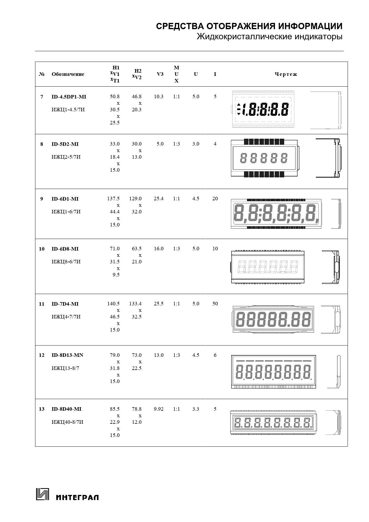 СРЕДСТВА ОТОБРАЖЕНИЯ ИНФОРМАЦИИ Жидкокристаллические индикаторы H1MH2№ ОбозначениеxV1xV3UU IЧ е р т е жxV2T1X7ID-4.5DP1-MI 50.8 46.8 10.3 1:1 5.0 5 x x ИЖЦ1-4.5/7И 30.5 20.3 x 25.5 8ID-5D2-MI 33.0 30.0 5.0 1:3 3.0 4 x x ИЖЦ2-5/7И 18.4 13.0 x 15.0 9ID-6D1-MI 137.5 129.0 25.4 1:1 4.5 20 x x ИЖЦ1-6/7И 44.4 32.0 x 15.0 10 ID-6D8-MI 71.0 63.5 16.0 1:3 5.0 10 x x ИЖЦ8-6/7И 31.5 21.0 x 9.5 11 ID-7D4-MI 140.5 133.4 25.5 1:1 5.0 50 x x ИЖЦ4-7/7И 46.5 32.5 x 15.0 12 ID-8D13-MN 79.0 73.0 13.0 1:3 4.5 6 x x ИЖЦ13-8/7 31.8 22.5 x 15.0 13 ID-8D40-MI 85.5 78.8 9.92 1:1 3.3 5 x x ИЖЦ40-8/7И 22.9 12.0 x 15.0