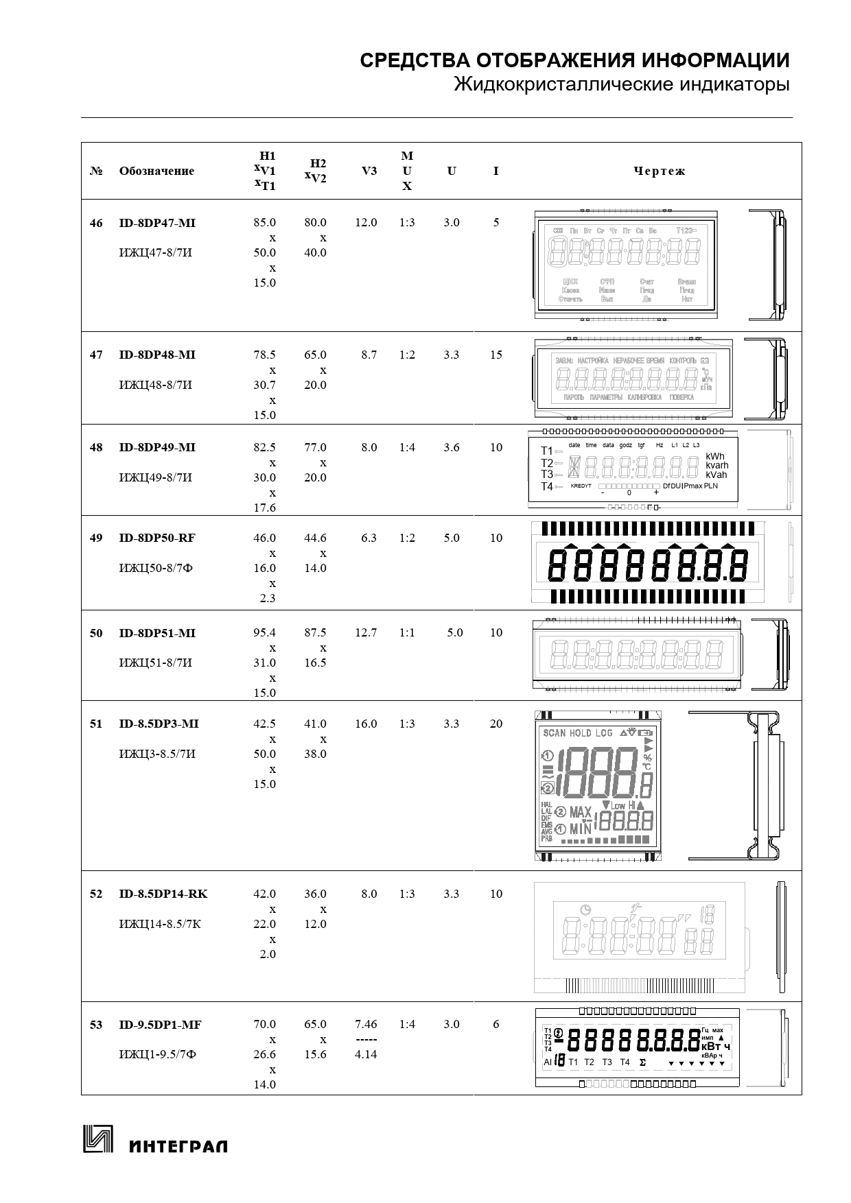 СРЕДСТВА ОТОБРАЖЕНИЯ ИНФОРМАЦИИ Жидкокристаллические индикаторы H1MH2№ ОбозначениеxV1xV3UU IЧ е р т е жxV2T1X46 ID-8DP47-MI 85.0 80.0 12.0 1:3 3.0 5 x x ИЖЦ47-8/7И 50.0 40.0 x 15.0 47 ID-8DP48-MI 78.5 65.0 8.7 1:2 3.3 15 x x ИЖЦ48-8/7И 30.7 20.0 x 15.0 48 ID-8DP49-MI 82.5 77.0 8.0 1:4 3.6 10 T1 date time data godz tgf Hz L1 L2 L3 x x kWh T2 kvarh ИЖЦ49-8/7И 30.0 20.0 T3 kVah x T4 KREDYT Df DU Pmax PLN - 0 + 17.6 49 ID-8DP50-RF 46.0 44.6 6.3 1:2 5.0 10 x x ИЖЦ50-8/7Ф 16.0 14.0 x 2.3 50 ID-8DP51-MI 95.4 87.5 12.7 1:1 5.0 10 x x ИЖЦ51-8/7И 31.0 16.5 x 15.0 51 ID-8.5DP3-MI 42.5 41.0 16.0 1:3 3.3 20 x x ИЖЦ3-8.5/7И 50.0 38.0 x 15.0 52 ID-8.5DP14-RK 42.0 36.0 8.0 1:3 3.3 10 x x ИЖЦ14-8.5/7К 22.0 12.0 x 2.0 53 ID-9.5DP1-MF 70.0 65.0 7.46 1:4 3.0 6 Т1Гц мах x x ----- Т2импТ3кВт ч ИЖЦ1-9.5/7Ф 26.6 15.6 4.14 Т4кВАр ч AI Т1 Т2 Т3 Т4 x 14.0