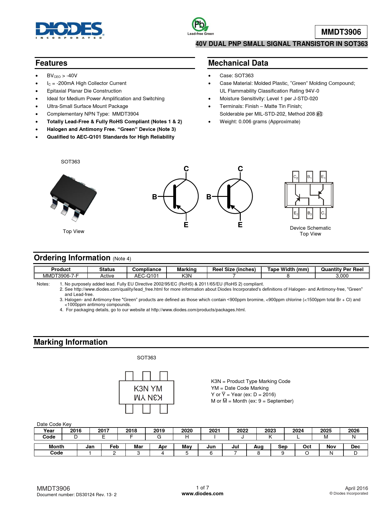 MMDT3906. 40V DUAL PNP SMALL SIGNAL TRANSISTOR IN SOT363. Features. Mechanical Data