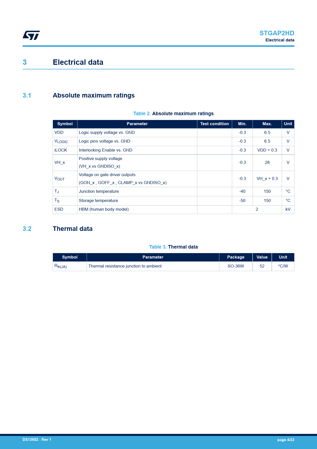 STGAP2HDElectrical data3Electrical data3.1Absolute maximum ratingsTable 2. Absolute maximum ratingsSymbolParameterTest conditionMin.Max.Unit VDD Logic supply voltage vs. GND -0.3 6.5 V VLOGIC Logic pins voltage vs. GND -0.3 6.5 V iLOCK Interlocking Enable vs. GND -0.3 VDD + 0.3 V Positive supply voltage VH_x -0.3 28 V (VH_x vs GNDISO_x) Voltage on gate driver outputs VOUT -0.3 VH_x + 0.3 V (GON_x , GOFF_x , CLAMP_x vs GNDISO_x) TJ Junction temperature -40 150 °C TS Storage temperature -50 150 °C ESD HBM (human body model) 2 kV 3.2Thermal dataTable 3. Thermal dataSymbolParameterPackageValueUnit Rth(JA) Thermal resistance junction to ambient SO-36W 52 °C/W DS13652 - Rev 1page 4/23 Document Outline Cover image Product status link / summary Features Application Description 1 Block diagram 2 Pin description and connection diagram 3 Electrical data 3.1 Absolute maximum ratings 3.2 Thermal data 3.3 Recommended operating conditions 4 Electrical characteristics 5 Isolation 6 Functional description 6.1 Gate driving power supply and UVLO 6.2 Power-up, power-down and ‘safe state’ 6.3 Control Inputs 6.4 Watchdog 6.5 Thermal shutdown protection 6.6 Standby function 6.7 Interlocking function 7 Typical application diagram 8 Layout 8.1 Layout guidelines and considerations 8.2 Layout example 9 Testing and characterization information 10 Package information 10.1 SO-36W package information 11 Suggested land pattern 12 Ordering information Revision history Contents List of tables List of figures