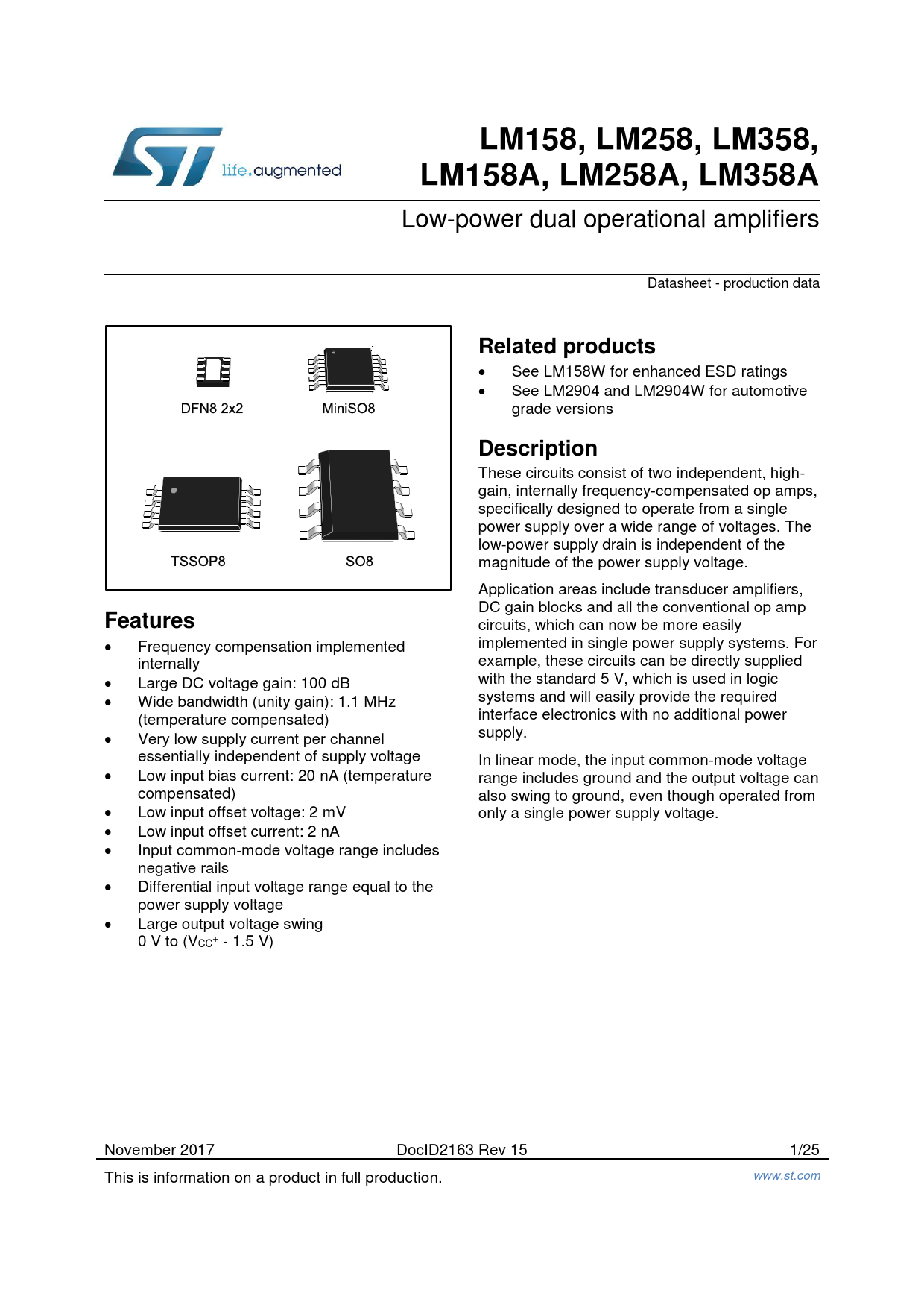 LM158, LM258, LM358,LM158A, LM258A, LM358A Low-power dual operational amplifiers Datasheet - production data Related products See LM158W for enhanced ESD ratings See LM2904 and LM2904W for automotive grade versions Description These circuits consist of two independent, high- gain, internally frequency-compensated op amps, specifically designed to operate from a single power supply over a wide range of voltages. The low-power supply drain is independent of the magnitude of the power supply voltage. Application areas include transducer amplifiers, DC gain blocks and all the conventional op amp Features circuits, which can now be more easily Frequency compensation implemented implemented in single power supply systems. For internally example, these circuits can be directly supplied Large DC voltage gain: 100 dB with the standard 5 V, which is used in logic Wide bandwidth (unity gain): 1.1 MHz systems and will easily provide the required (temperature compensated) interface electronics with no additional power Very low supply current per channel supply. essentially independent of supply voltage In linear mode, the input common-mode voltage Low input bias current: 20 nA (temperature range includes ground and the output voltage can compensated) also swing to ground, even though operated from Low input offset voltage: 2 mV only a single power supply voltage. Low input offset current: 2 nA Input common-mode voltage range includes negative rails Differential input voltage range equal to the power supply voltage Large output voltage swing 0 V to (V + CC - 1.5 V) November 2017 DocID2163 Rev 15 1/25 This is information on a product in full production. www.st.com Document Outline 1 Schematic diagram 2 Package pin connections 3 Absolute maximum ratings 4 Electrical characteristics 5 Electrical characteristic curves 6 Typical applications 7 Package information 7.1 SO8 package information 7.2 MiniSO8 package information 7.3 DFN8 2x2 package information 7.4 TSSOP8 package information 8 Ordering information 9 Revision history