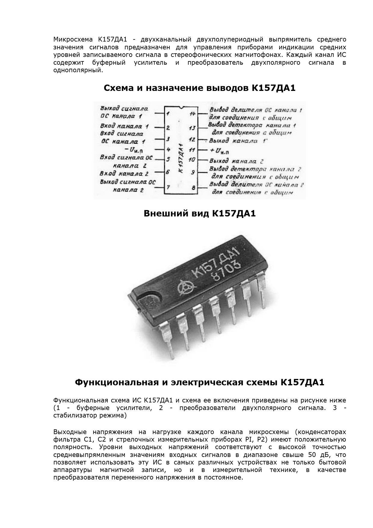 Микросхема К157ДА1 - двухканальный двухполупериодный выпрямитель среднего значения сигналов предназначен для управления приборами индикации средних уровней записываемого сигнала в стереофонических магнитофонах. Каждый канал ИС содержит буферный усилитель и преобразователь двухполярного сигнала в однополярный. Схема и назначение выводов К157ДА1Внешний вид К157ДА1Функциональная и электрическая схемы К157ДА1 Функциональная схема ИС К157ДА1 и схема ее включения приведены на рисунке ниже (1 - буферные усилители, 2 - преобразователи двухполярного сигнала. 3 - стабилизатор режима) Выходные напряжения на нагрузке каждого канала микросхемы (конденсаторах фильтра С1, С2 и стрелочных измерительных приборах PI, P2) имеют положительную полярность. Уровни выходных напряжений соответствуют с высокой точностью средневыпрямленным значениям входных сигналов в диапазоне свыше 50 дБ, что позволяет использовать эту ИС в самых различных устройствах не только бытовой аппаратуры магнитной записи, но и в измерительной технике, в качестве преобразователя переменного напряжения в постоянное.