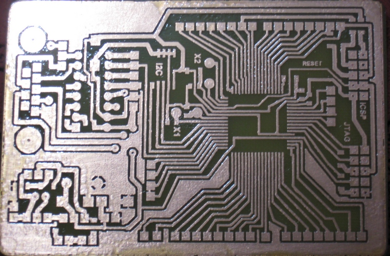 В итоге макетная плата содержит:мк, кварц 16 Мгц, кварц 32 кГц, EEPROM 24LC65, порт и драйвер (MAX232) RS232, регуляторы напряжения 5 В и 3.3 В, светодиод индикации питания, коннектор для внутрисхемного программирования, коннектор интерфейса JTAG.