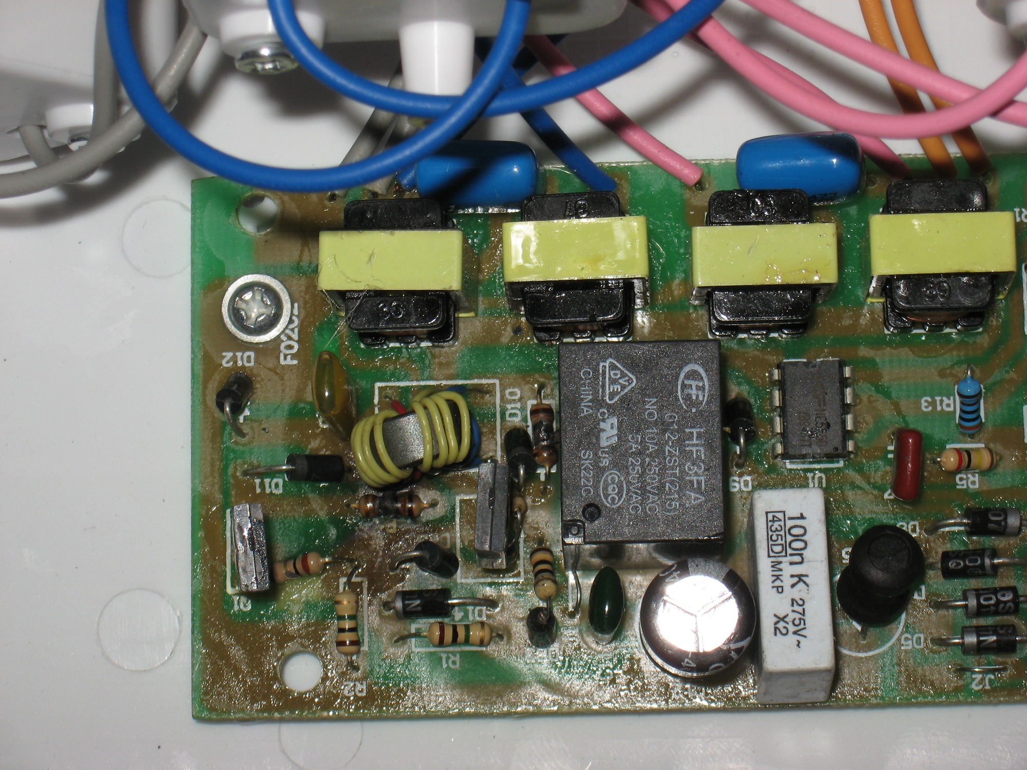 . Честно скажу – жаба задавила, тем более что прослужила она очень мало.Разобрал я ее, и увидел стандартную схему балласта энергосберегающей лампы, только монтаж и качество пайки ужасное, если не хуже. Не беру в расчет схему таймера включения ламп на 120 секунд – она работает исправно, разве что релюшка самая дешевая с некачественными контактами.