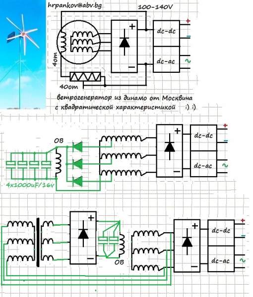 Мне-бы это описание лет 20-25 назад. Был в ремонте блок 4 кВт, сделал но с огромным трудом. Рисовал схему с платы. По трансформатору: выходные напряжения должны обеспечивать работу блока при минимально допустимой скорости ветра, вроде так. Лучше произвести натурные измерения и мотануть транс.