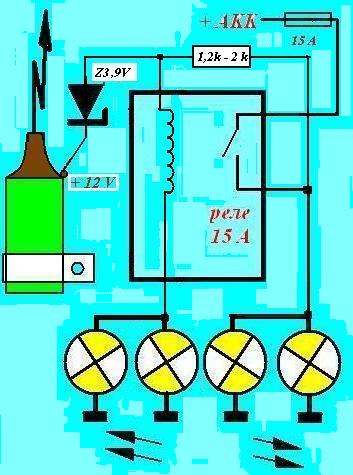 Уважаемый, зачем хамите? Критика должна быть конструктивной. Схема работает без замечаний около двух лет. Я считаю, что ток 200 мА, который потребляет обмотка реле , подключённая параллельно питанию системы зажигания никакого влияния на неё не оказывает.Штатные противотуманные фары на ваз 21053 отсутствуют, поэтому их пришлось устанавливать дополнительно. Правила при этом никак не нарушены- могут работать отдельно и совместно с ближним светом фар. При этом надо отметить простоту реализации выполнения требования ПДД. В чём криминал?