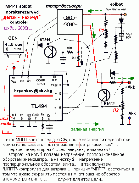 Тов. Сашун, ето хорошо что Ви познакомились с кубической зависимости в ветроенергетике. Хвала и честь... То что Ви озаботили нас о двух крайних состояний вертушки, когда ветра еле-еле и когда ветра типа "стой дурак дома" ето тоже аплодируется населением... Но то что Ви, из етих двух крайних состояния дела, сделали кардинальний вивод о непригодности моего "АЛУ" и моего контроллера МППТ - ето простите возмущает... Давайте пожалуста по делу, о возможном совмещений некоторих частей некоторих схемок изложенних мною, чтобь все били сити и довольни! ..Вот некоторий рецепт которим я пользуюсь пока теща и жена на работе: сижу на свежем воздухе на веранде и глазею на попитки молодих наших Джентльменов завоевать внимание наших молодих Лейди... Моя уверенность в продолжению рода увеличивается ежесекундно... Рядишком в мою подмогу лиш утренний порцион ракии в 150мл, да тарелка с нарезанними в ней 100гр помидоров, 100гр огурчиков, 100гр бринзи, лучок, петрушка, подсолнечное масло по вкусу.. Надежда одна что теща и жена задержатся подольше на работе или с подругами... Не оставляйте меня пожалуста только с одной надеждой. Помогите по указанним в темме вопросам.