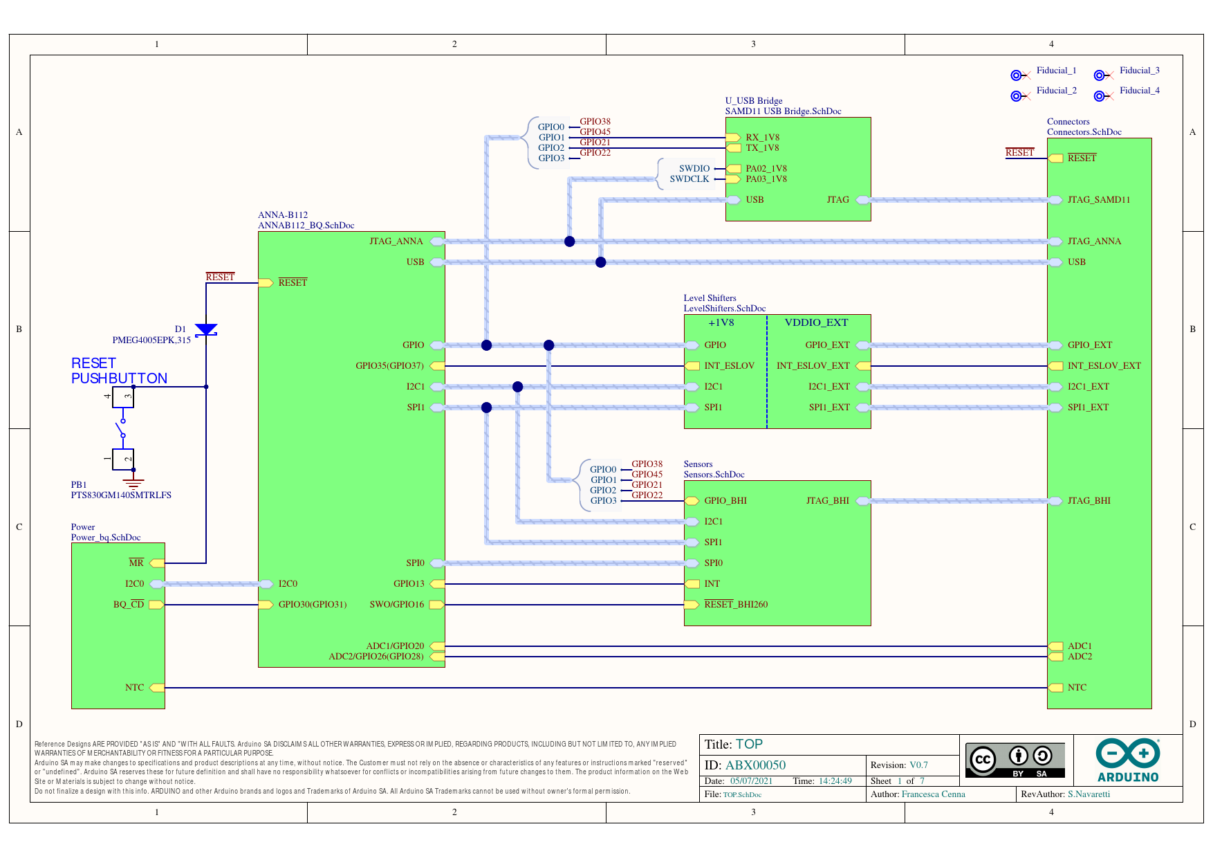 WARRANTIES OF MERCHANTABILITY OR FITNESS FOR A PARTICULAR PURPOSE. Arduino SA may make changes to specifications and product descriptions at any time, without notice. The Customer must not rely on the absence or characteristics of any features or instructions marked "reserved" ID: ABX00050 Revision: V0.7 or "undefined". Arduino SA reserves these for future definition and shall have no responsibility whatsoever for conflicts or incompatibilities arising from future changes to them. The product information on the Web Site or Materials is subject to change without notice. Date: 05/07/2021 Time: 14:24:49 Sheet 1 of 7 Do not finalize a design with this info. ARDUINO and other Arduino brands and logos and Trademarks of Arduino SA. All Arduino SA Trademarks cannot be used without owner's formal permission. File: TOP.SchDoc Author: Francesca Cenna RevAuthor: S.Navaretti 1 2 3 4 Document Outline Schematic Prints("All Documents",Physical) TOP.SchDoc(TOP) ANNAB112_BQ.SchDoc(ANNA-B112) Components C2 C2-1 C2-2 C17 C17-1 C17-2 DL1 DL1-1 DL1-2 DL1-3 DL1-4 MD1 MD1-1 MD1-2 MD1-3 MD1-4 MD1-5 MD1-6 MD1-7 MD1-8 MD1-9 MD1-10 MD1-11 MD1-12 MD1-13 MD1-14 MD1-15 MD1-16 MD1-17 MD1-18 MD1-19 MD1-20 MD1-21 MD1-22 MD1-23 MD1-24 MD1-25 MD1-26 MD1-27 MD1-28 MD1-29 MD1-30 MD1-31 MD1-32 MD1-33 MD1-34 MD1-35 MD1-36 MD1-37 MD1-38 MD1-39 MD1-40 MD1-41 MD1-42 MD1-43 MD1-44 MD1-45 MD1-46 MD1-47 MD1-48 MD1-49 MD1-50 MD1-51 MD1-52 MD1-RSVD_GPIO26 MD1-RSVD_GPIO47 MD1-RSVD_GPIO52 MD1-RSVD_VBUS R3 R3-1 R3-2 R4 R4-1 R4-2 R6 R6-1 R6-2 R7 R7-1 R7-2 R9 R9-1 R9-2 R10 R10-1 R10-2 R11 R11-1 R11-2 R12 R12-1 R12-2 R13 R13-1 R13-2 R31 R31-1 R31-2 R32 R32-1 R32-2 U7 U7-1 U7-2 U7-3 U7-4 U7-5 U7-6 U7-7 U7-8 U7-9 U8 U8-A1 U8-A2 U8-B1 U8-B2 U8-C1 U8-C2 U8-D1 U8-D2 Y1 Y1-1 Y1-2 Y1-3 Y1-4 Nets +1V8 Pins C2-2 C17-1 MD1-9 R3-2 R4-2 R6-2 R7-2 R10-2 R11-2 R12-2 R13-2 U7-3 U7-8 Y1-3 BLUE Pins DL1-3 U8-B2 NetLabels BLUE CIPO0 Pins MD1-23 U7-2 NetLabels CIPO0 CIPO0 Ports CIPO0 CIPO1 Pins MD1-28 NetLabels CIPO1 Ports CIPO1 CLK_32.768k Pins MD1-17 Y1-2 NetLabels CLK_32.768k CLK_32.768k COPI0 Pins MD1-24 U7-5 NetLabels COPI0 COPI0 Ports COPI0 COPI1 Pins MD1-29 NetLabels COPI1 Ports COPI1 CS0 Pins MD1-25 NetLabels CS0 Ports CS0 CS1 Pins MD1-27 NetLabels CS1 Ports CS1 CS_FLASH Pins MD1-31 R7-1 U7-1 NetLabels CS_FLASH CS_FLASH DR_N Pins MD1-33 R32-2 NetLabels DR_N DR_P Pins MD1-32 R31-2 NetLabels DR_P GND Pins C2-1 C17-2 MD1-2 MD1-3 MD1-4 MD1-7 MD1-8 MD1-10 MD1-11 MD1-18 MD1-41 MD1-42 MD1-43 MD1-44 MD1-46 MD1-47 MD1-48 MD1-49 MD1-50 MD1-51 MD1-52 U7-4 U7-9 U8-D1 Y1-1 Y1-4 GPIO21 Pins MD1-21 NetLabels GPIO21 Ports GPIO21 GPIO22 Pins MD1-22 NetLabels GPIO22 Ports GPIO22 GPIO35 Pins MD1-35 R3-1 NetLabels GPIO35 GPIO35 Ports GPIO35 GPIO38 Pins MD1-38 NetLabels GPIO38 Ports GPIO38 GPIO45 Pins MD1-45 NetLabels GPIO45 Ports GPIO45 GREEN Pins DL1-4 U8-C2 NetLabels GREEN NetMD1_1 Pins MD1-1 NetMD1_5 Pins MD1-5 MD1-6 NetMD1_12 Pins MD1-12 R6-1 Ports NetMD1_12 NetMD1_13 Pins MD1-13 Ports NetMD1_13 NetMD1_16 Pins MD1-16 Ports NetMD1_16 NetMD1_20 Pins MD1-20 Ports NetMD1_20 NetMD1_26 Pins MD1-26 Ports NetMD1_26 NetMD1_30 Pins MD1-30 Ports NetMD1_30 NetMD1_39 Pins MD1-39 Ports NetMD1_39 NetMD1_40 Pins MD1-40 Ports NetMD1_40 NetMD1_RSVD_GPIO26 Pins MD1-RSVD_GPIO26 NetMD1_RSVD_GPIO47 Pins MD1-RSVD_GPIO47 NetMD1_RSVD_GPIO52 Pins MD1-RSVD_GPIO52 NetMD1_RSVD_VBUS Pins MD1-RSVD_VBUS Ports NetMD1_RSVD_VBUS NetR9_2 Pins R9-2 U8-A1 NetR12_1 Pins R12-1 U7-7 NetR31_1 Pins R31-1 Ports NetR31_1 NetR32_1 Pins R32-1 Ports NetR32_1 RED Pins DL1-2 U8-D2 NetLabels RED SCL0 Pins MD1-15 R11-1 U8-C1 NetLabels SCL0 SCL0 SCL0 Ports SCL0 SCL1 Pins MD1-37 R13-1 NetLabels SCL1 SCL1 Ports SCL1 SCLK0 Pins MD1-19 U7-6 NetLabels SCLK0 SCLK0 Ports SCLK0 SCLK1 Pins MD1-34 NetLabels SCLK1 Ports SCLK1 SDA0 Pins MD1-14 R10-1 U8-B1 NetLabels SDA0 SDA0 SDA0 Ports SDA0 SDA1 Pins MD1-36 R4-1 NetLabels SDA1 SDA1 Ports SDA1 V_PMID Pins DL1-1 R9-1 U8-A2 Ports ADC1/GPIO20 ADC2/GPIO26(GPIO28) GPIO GPIO13 GPIO30(GPIO31) GPIO35(GPIO37) GPIO.GPIO0 GPIO.GPIO1 GPIO.GPIO2 GPIO.GPIO3 I2C0 I2C0.SCL I2C0.SDA I2C1 I2C1.SCL I2C1.SDA JTAG_ANNA JTAG_ANNA.SWDCLK JTAG_ANNA.SWDIO R\E\S\E\T\ SPI0 SPI0.CIPO SPI0.COPI SPI0.CS SPI0.SCLK SPI1 SPI1.CIPO SPI1.COPI SPI1.CS SPI1.SCLK SWO/GPIO16 USB USB.D_N USB.D_P USB.VBUS SAMD11 USB Bridge.SchDoc("U_USB Bridge") Components 3V3 3V3-X C18 C18-1 C18-2 C19 C19-1 C19-2 C20 C20-1 C20-2 C28 C28-1 C28-2 R28 R28-1 R28-2 R30 R30-1 R30-2 R34 R34-1 R34-2 R35 R35-1 R35-2 U1 U1-1 U1-2 U1-3 U1-4 U1-5 U1-6 U1-7 U1-8 U1-9 U1-10 U1-11 U1-12 U1-13 U1-14 U1-15 U1-16 U1-17 U1-18 U1-19 U1-20 U1-21 U1-22 U1-23 U1-24 U1-EXP U13 U13-A1 U13-A2 U13-A3 U13-B1 U13-B2 U13-B3 U13-C1 U13-C2 U13-C3 U13-D1 U13-D2 U13-D3 U14 U14-1 U14-2 U14-3 U14-4 U14-5 Nets +1V8 Pins C19-2 U13-B2 +3V3 Pins 3V3-X C18-1 C28-1 R28-1 R30-2 U1-24 U13-A2 U14-5 D_N Pins U1-21 NetLabels D_N D_N Ports D_N D_P Pins U1-22 NetLabels D_P D_P Ports D_P GND Pins C18-2 C19-1 C20-2 C28-2 R35-2 U1-23 U1-EXP U13-D2 U14-2 NetR28_2 Pins R28-2 U1-18 NetR34_1 Pins R34-1 R35-1 U13-C2 NetU1_5 Pins U1-5 NetU1_6 Pins U1-6 NetU1_8 Pins U1-8 NetU1_9 Pins U1-9 NetU1_10 Pins U1-10 NetU1_11 Pins U1-11 NetU1_12 Pins U1-12 NetU1_13 Pins U1-13 NetU1_14 Pins U1-14 NetU1_15 Pins U1-15 NetU1_16 Pins U1-16 NetU1_17 Pins U1-17 NetU13_A3 Pins U13-A3 Ports NetU13_A3 NetU13_B3 Pins U13-B3 Ports NetU13_B3 NetU13_C3 Pins U13-C3 Ports NetU13_C3 NetU13_D3 Pins U13-D3 Ports NetU13_D3 NetU14_4 Pins U14-4 OE Pins R34-2 U1-3 NetLabels OE OE PA02 Pins U1-1 U13-B1 NetLabels PA02 PA02 PA03 Pins U1-2 U13-A1 NetLabels PA03 PA03 PA05 Pins U1-4 U13-D1 NetLabels PA05 PA05 PA08 Pins U1-7 U13-C1 NetLabels PA08 PA08 SWCLK Pins U1-19 NetLabels SWCLK Ports SWCLK SWDIO Pins R30-1 U1-20 NetLabels SWDIO Ports SWDIO VBUS_USB Pins C20-1 U14-1 U14-3 Ports VBUS_USB Ports JTAG JTAG.SWDCLK JTAG.SWDIO PA02_1V8 PA03_1V8 RX_1V8 TX_1V8 USB USB.D_N USB.D_P USB.VBUS Connectors.SchDoc(Connectors) Components C16 C16-1 C16-2 C22 C22-1 C22-2 D2 D2-1 D2-2 D2-3 D2-4 D2-5 D2-6 DN DN-X DP DP-X J1 J1-1 J1-2 J1-3 J1-4 J1-5 J