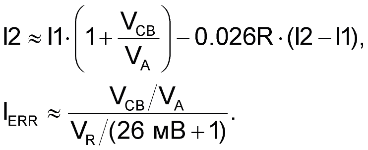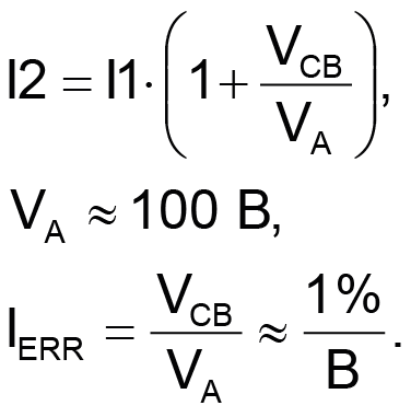 Если два транзистора согласованы, ток I2 должен быть равен току I1. Но вместо этого ток коллектора Q2 может увеличиваться на 1% на каждый вольт напряжения VCB. Двузначное значение VCB может привести к двузначному проценту погрешности. «Зеркало» получилось бы довольно затуманенным!