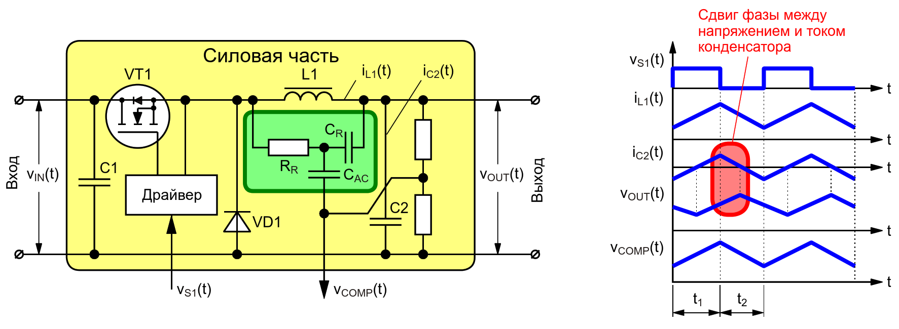 Рисунок 5. Понижающий преобразователь с гистерезисным методом управления с постоянным временем включения транзистора t