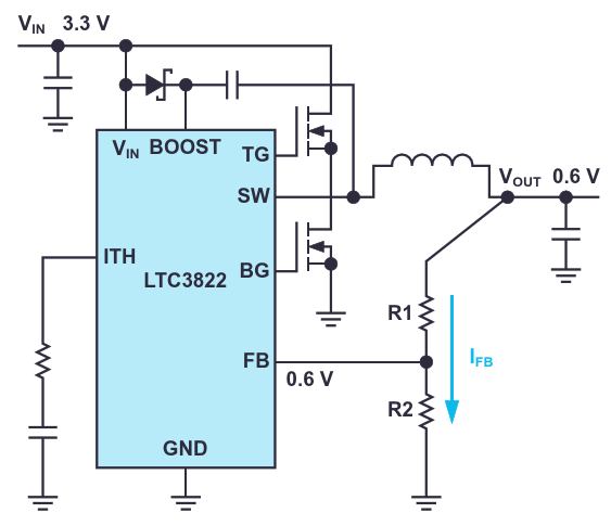 DC/DC преобразователь LTC3822 может использоваться для стабилизации низких выходных напряжений вплоть до 0.6 В