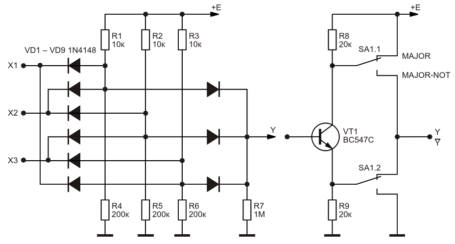 Рисунок 1. Электрическая схема диодно-транзисторного трехвходового логического элемента «Мажоритарность» («MAJOR») и «Мажоритарность-НЕ» («MAJOR-NOT»)
