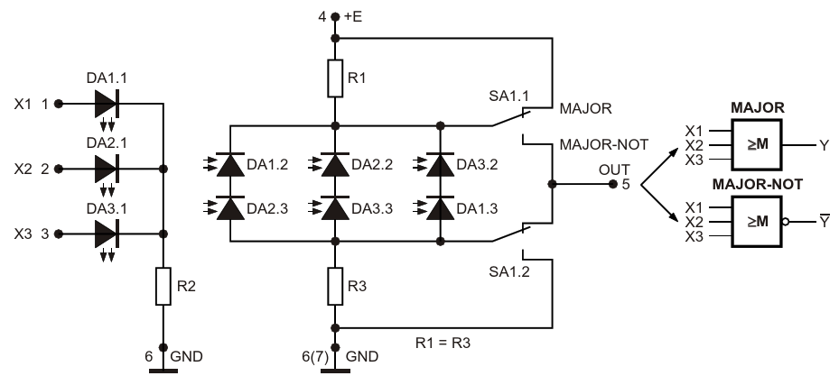 Рисунок 3. Электрическая схема оптоэлектронного трехвходового логического элемента, выполняющего функции «Мажоритарность» («MAJOR») и «Мажоритарность-НЕ» («MAJOR-NOT»)