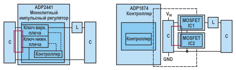 Рисунок 2. Структурные схемы монолитного импульсного регулятора (слева) и решения на основе микросхемы контроллера (справа), на каждой из которых отмечено положение горячей петли