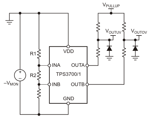 Супервизор TPS3700/1, сконфигурированный для контроля отрицательного напряжения