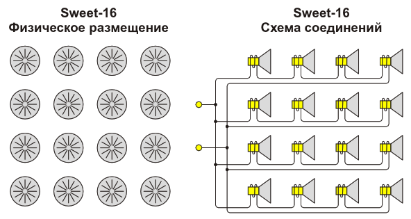 Рисунок 1. 16 динамиков можно соединить между собой так, чтобы их полное сопротивление между двумя клеммами было таким же, как полные сопротивления отдельных динамиков