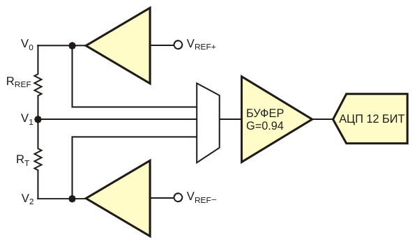 Рисунок 3. Используя мультиплексирование в один буфер и один аналого-цифровой преобразователь, идею можно расширить на несколько датчиков и путей прохождения сигналов