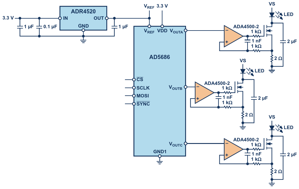 Рисунок 1. Упрощенная схема драйвера для управления тремя отдельными светодиодами
