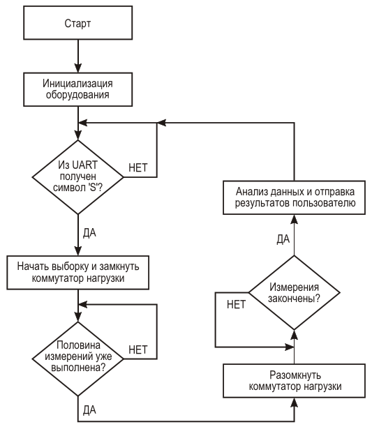 Алгоритм теста ЭДО, блок-схема которого показана на этом рисунке, подключает нагрузку, производит выборки напряжения в течение половины времени тестирования, а затем отключает нагрузку и прекращает выборку напряжений