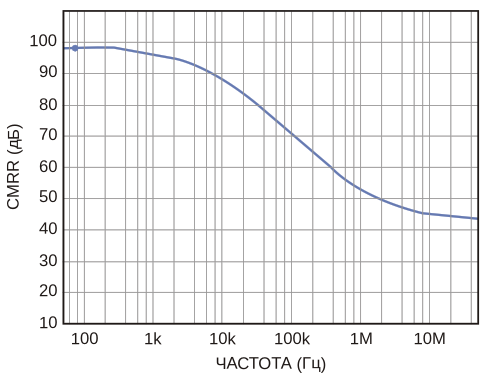График зависимости коэффициента подавления синфазного сигнала (CMRR) от частоты для схемы Рисунок 1 дает значение 98 дБ