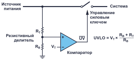 Схема блокировки при пониженном напряжении источника питания, в которой используются резистивный делитель, компаратор и силовой коммутатор