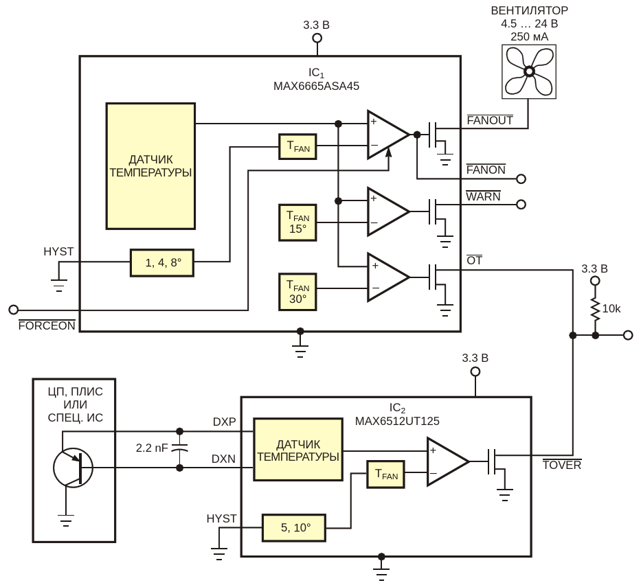 Эта схема обеспечивает управление вентилятором и защиту от перегрева систем и цифровых микросхем, потребляющих большую мощность