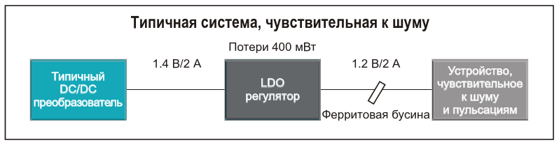 Типичная малошумящая архитектура, основанная на использовании DC/DC преобразователя, LDO регулятора и фильтра с ферритовой бусиной