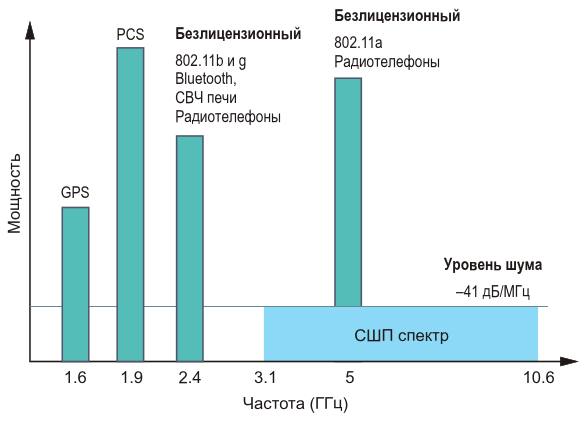 Рисунок 5. Сигналы, переданные импульсной радиосистемой, занимают широкую полосу частот