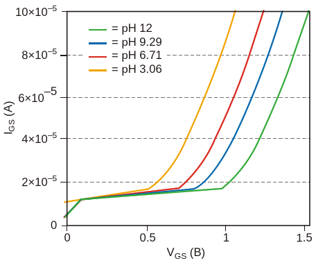 Напряжение затвор-исток ISFET изменяется в зависимости от степени кислотности