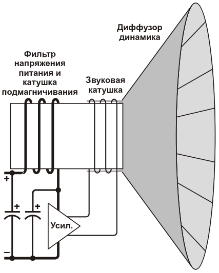 Упрощенная схема конструкции динамика с катушкой подмагничивания