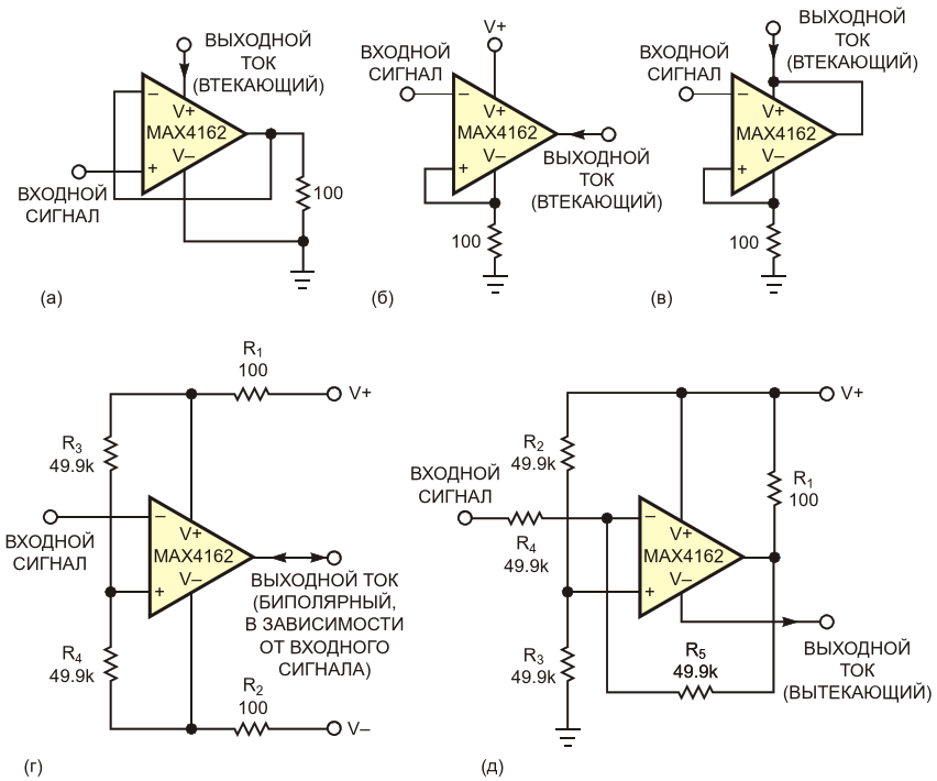 Рисунок 2. На этих графиках показаны зависимости выходного тока от выходного напряжения для схем на Рисунке 1. Обратите внимание, что для схем (б) и (в) характеристики динамического выходного сопротивления очень похожи на характеристику идеального источника тока: ΔV