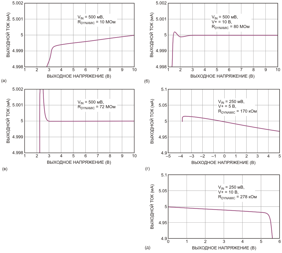 На этих графиках показаны зависимости выходного тока от выходного напряжения для схем на Рисунке 1. Обратите внимание, что для схем (б) и (в) характеристики динамического выходного сопротивления очень похожи на характеристику идеального источника тока: ΔV