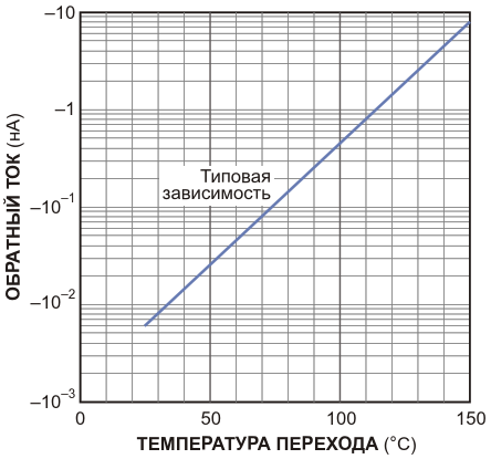 Рисунок 1. Обратный ток p-n перехода диода экспоненциально зависит от температуры. Увеличение температуры примерно на 12 K удваивает ток утечки