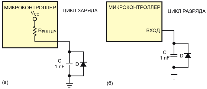 Конденсатор C сначала заряжается через подтягивающий резистор линии вывода-ввода микроконтроллера, сконфигурированной как выход (а). Затем конденсатор разряжается обратным током утечки диода D (б)