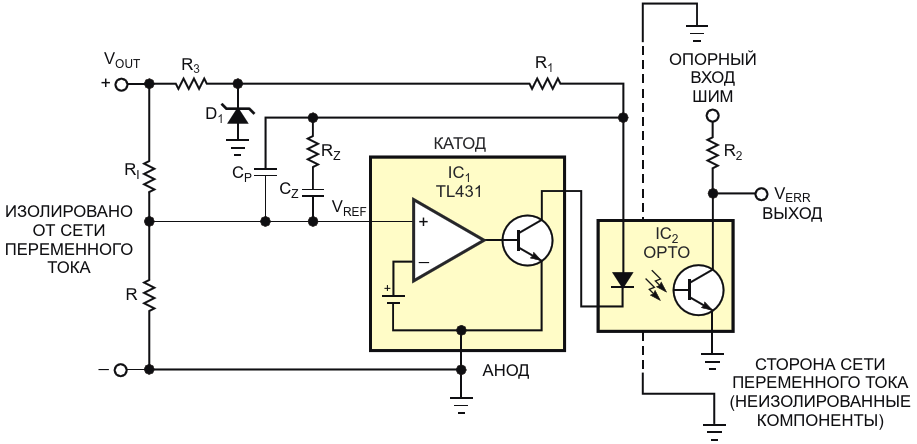 Рисунок 2. TL431 заменяет более дорогой операционный усилитель в цепи обратной связи ШИМ этого источника питания