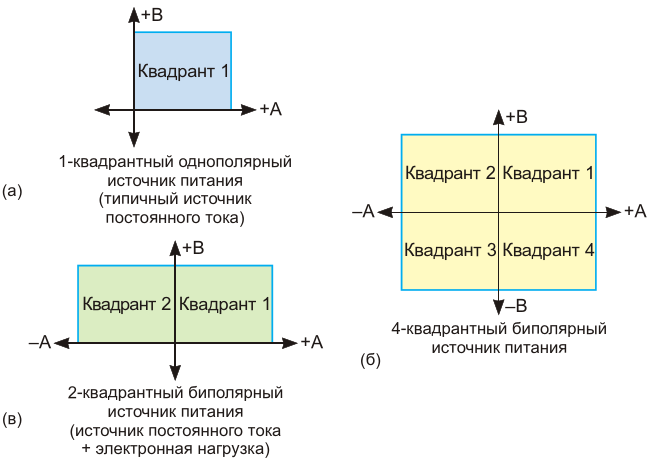 Источники питания могут быть сконфигурированы как 1-квадрантный однополярный, 2-квадрантный однополярный и 4-квадрантный двуполярный, чтобы вырабатывать положительное и отрицательное напряжение