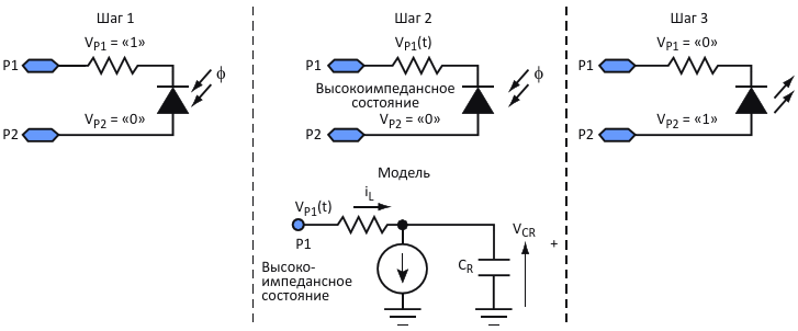 Рисунок 2. Работа схемы светодиодного фотодиода происходит за три шага; управление осуществляется с помощью микроконтроллера и программной процедуры
