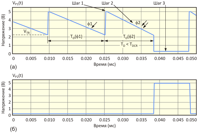 Рисунок 3. При большей интенсивности света на светодиоде время спада напряжения TD, в течение которого разряжается емкость диода на входе порта P1, меньше (а). Напряжение на выводе P2 становится высоким, если TD превышает TDCR (б). Э